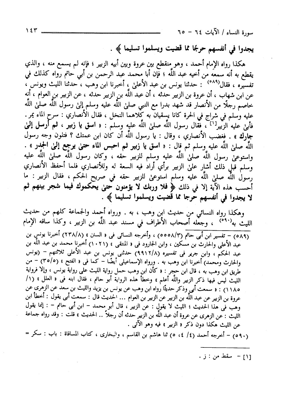 يَجِدُوا فِي أَنْفُسهمْ حَرَجًا مِمَّا قَضَيْت وَيُسَلِّمُوا تَسْلِيمًا " هَكَذَا رَوَاهُ الْإِمَام أَحْمَد وَهُوَ مُنْقَطِع بَيْن عُرْوَة وَبَيْن أَبِيهِ الزُّبَيْر فَإِنَّهُ لَمْ يَسْمَع مِنْهُ وَاَلَّذِي يَقْطَع بِهِ أَنَّهُ سَمِعَهُ مِنْ أَخِيهِ عَبْد اللَّه فَإِنَّ أَبَا مُحَمَّد عَبْد الرَّحْمَن بْن أَبِي حَاتِم رَوَاهُ كَذَلِكَ فِي تَفْسِيره فَقَالَ : حَدَّثَنَا يُونُس بْن عَبْد الْأَعْلَى حَدَّثَنَا اِبْن وَهْب أَخْبَرَنِي اللَّيْث وَيُونُس عَنْ اِبْن شِهَاب أَنَّ عُرْوَة بْن الزُّبَيْر حَدَّثَهُ أَنَّ عَبْد اللَّه بْن الزُّبَيْر حَدَّثَهُ عَنْ الزُّبَيْر بْن الْعَوَّام أَنَّهُ خَاصَمَ رَجُلًا مِنْ الْأَنْصَار قَدْ شَهِدَ بَدْرًا مَعَ النَّبِيّ صَلَّى اللَّه عَلَيْهِ وَسَلَّمَ إِلَى رَسُول اللَّه صَلَّى اللَّه عَلَيْهِ وَسَلَّمَ فِي شِرَاج فِي الْحَرَّة كَانَا يَسْقِيَانِ بِهِ كِلَاهُمَا النَّخْل فَقَالَ الْأَنْصَارِيّ : سَرِّحْ الْمَاء يَمُرّ فَأَبَى عَلَيْهِ الزُّبَيْر فَقَالَ رَسُول اللَّه صَلَّى اللَّه عَلَيْهِ وَسَلَّمَ " اِسْقِ يَا زُبَيْر ثُمَّ أَرْسِلْ إِلَى جَارك " فَغَضِبَ الْأَنْصَارِيّ وَقَالَ : يَا رَسُول اللَّه أَنْ كَانَ اِبْن عَمَّتك ؟ فَتَلَوَّنَ وَجْه رَسُول اللَّه صَلَّى اللَّه عَلَيْهِ وَسَلَّمَ ثُمَّ قَالَ " اِسْقِ يَا زُبَيْر ثُمَّ اِحْبِسْ الْمَاء حَتَّى يَرْجِع إِلَى الْجُدُر " وَاسْتَوْعَى رَسُول اللَّه صَلَّى اللَّه عَلَيْهِ وَسَلَّمَ لِلزُّبَيْرِ حَقّه وَكَانَ