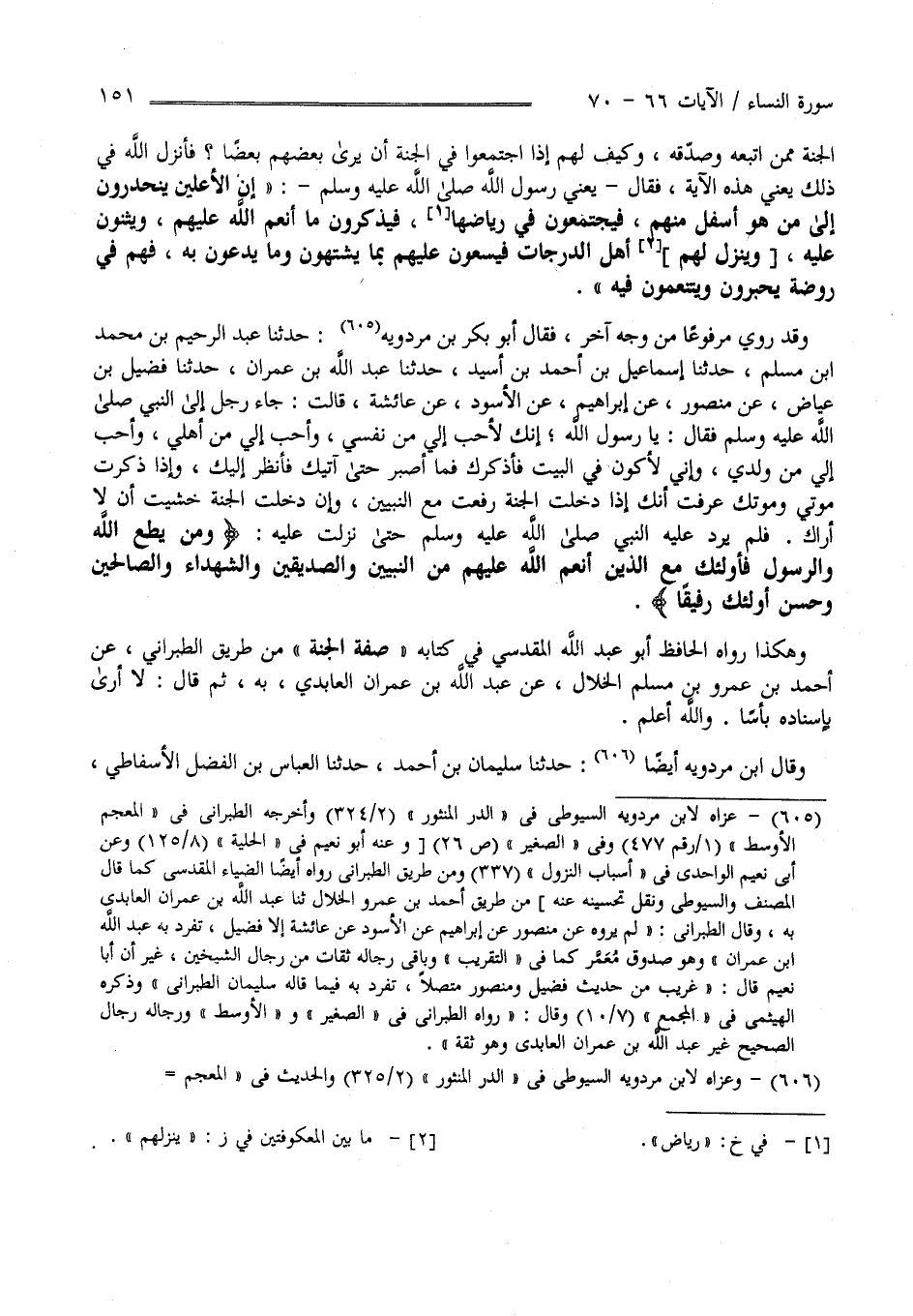الْجَنَّة مِمَّنْ اِتَّبَعَهُ وَصَدَّقَهُ وَكَيْف لَهُمْ إِذَا اِجْتَمَعُوا فِي الْجَنَّة أَنْ يَرَى بَعْضهمْ بَعْضًا فَأَنْزَلَ اللَّه فِي ذَلِكَ يَعْنِي هَذِهِ الْآيَة فَقَالَ يَعْنِي رَسُول اللَّه صَلَّى اللَّه عَلَيْهِ وَسَلَّمَ " إِنَّ الْأَعْلَيْنَ يَنْحَدِرُونَ إِلَى مَنْ هُوَ أَسْفَل مِنْهُمْ فَيَجْتَمِعُونَ فِي رِيَاض فَيَذْكُرُونَ مَا أَنْعَمَ اللَّه عَلَيْهِمْ وَيُثْنُونَ عَلَيْهِ وَيَنْزِل لَهُمْ أَهْل الدَّرَجَات فَيَسْعَوْنَ عَلَيْهِمْ بِمَا يَشْتَهُونَ وَمَا يَدْعُونَ بِهِ فَهُمْ فِي رَوْضَة يُحْبَرُونَ وَيَتَنَعَّمُونَ فِيهِ " وَقَدْ رُوِيَ مَرْفُوعًا مِنْ وَجْه آخَر فَقَالَ أَبُو بَكْر بْن مَرْدَوَيْهِ : حَدَّثَنَا عَبْد الرَّحِيم بْن مُحَمَّد بْن مُسْلِم حَدَّثَنَا إِسْمَاعِيل بْن أَحْمَد بْن أُسَيْد حَدَّثَنَا عَبْد اللَّه بْن عِمْرَان حَدَّثَنَا فُضَيْل بْن عِيَاض عَنْ مَنْصُور عَنْ إِبْرَاهِيم عَنْ الْأَسْوَد عَنْ عَائِشَة قَالَتْ جَاءَ رَجُل إِلَى النَّبِيّ صَلَّى اللَّه عَلَيْهِ وَسَلَّمَ فَقَالَ : يَا رَسُول اللَّه : إِنَّك لَأَحَبّ إِلَيَّ مِنْ نَفْسِي وَأَحَبّ إِلَيَّ مِنْ أَهْلِي وَأَحَبّ إِلَيَّ مِنْ وَلَدِي وَإِنِّي لَأَكُون فِي الْبَيْت فَأَذْكُرك فَمَا أَصْبِر حَتَّى آتِيك فَأَنْظُر إِلَيْك وَإِذَا ذَكَرْت مَوْتِي وَمَوْتك عَرَفْت أَنَّك إِذَا دَخَلْت الْجَنَّة رُفِعْت مَعَ النَّبِيِّينَ وَإِنْ دَخَلْت الْجَنَّة خَشِيت أَنْ لَا أَرَاك فَلَمْ يَرُدّ عَلَيْهِ النَّبِيّ صَلَّى حَتَّى نَزَلَتْ عَلَيْهِ وَمَنْ يُطِعْ اللَّه وَالرَّسُول فَأُولَئِكَ مَعَ الَّذِينَ أَنْعَمَ اللَّه عَلَيْهِمْ مِنْ النَّبِيِّينَ وَالصِّدِّيقِينَ وَالشُّهَدَاء وَالصَّالِحِينَ وَحَسُنَ أُولَئِكَ رَفِيقًا وَهَكَذَا رَوَاهُ الْحَافِظ أَبُو عَبْد اللَّه الْمَقْدِسِيّ فِي كِتَابه فِي صِفَة الْجَنَّة مِنْ طَرِيق الطَّبَرَانِيّ عَنْ أَحْمَد بْن عَمْرو بْن مُسْلِم الْخَلَّال عَنْ عَبْد اللَّه بْن عِمْرَان الْعَابِدِيّ بِهِ ثُمَّ قَالَ : لَا أَرَى بِإِسْنَادِهِ بَأْسًا وَاَللَّه أَعْلَم.