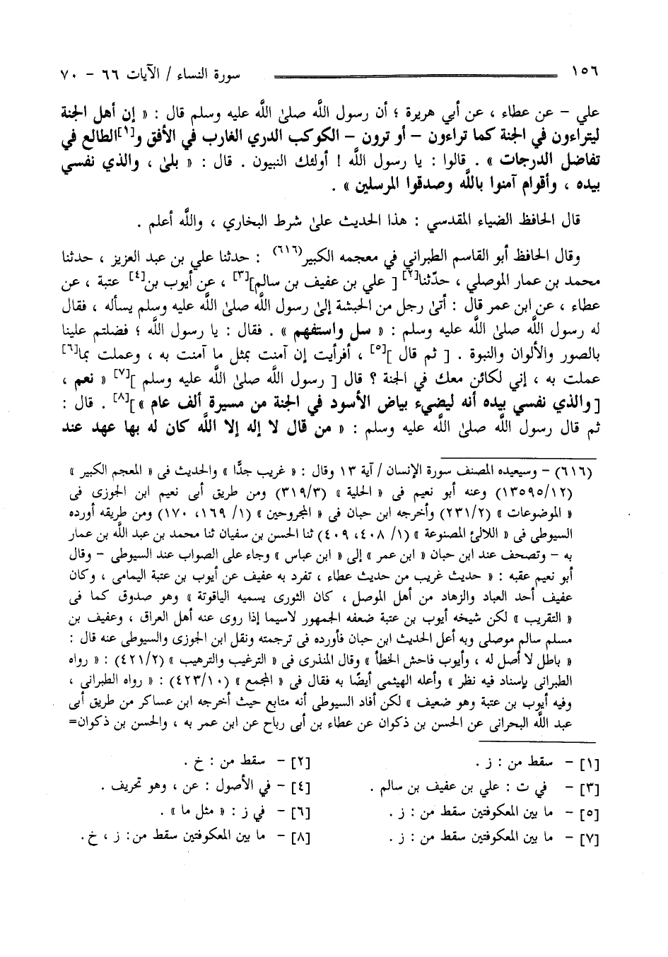 عَلِيّ عَنْ عَطَاء عَنْ أَبِي هُرَيْرَة أَنَّ رَسُول اللَّه صَلَّى اللَّه عَلَيْهِ وَسَلَّمَ قَالَ " إِنَّ أَهْل الْجَنَّة لَيَتَرَاءَوْنَ فِي الْجَنَّة كَمَا تَرَاءَوْنَ - أَوْ تَرَوْنَ - الْكَوْكَب الدُّرِّيّ الْغَابِر فِي الْأُفُق الطَّالِع فِي تَفَاضُل الدَّرَجَات " قَالُوا : يَا رَسُول اللَّه أُولَئِكَ النَّبِيُّونَ قَالَ " بَلَى وَاَلَّذِي نَفْسِي بِيَدِهِ رِجَال آمَنُوا بِاَللَّهِ وَصَدَّقُوا الْمُرْسَلِينَ " قَالَ الْحَافِظ الضِّيَاء الْمَقْدِسِيّ : هَذَا الْحَدِيث عَلَى شَرْط الْبُخَارِيّ وَاَللَّه أَعْلَم .