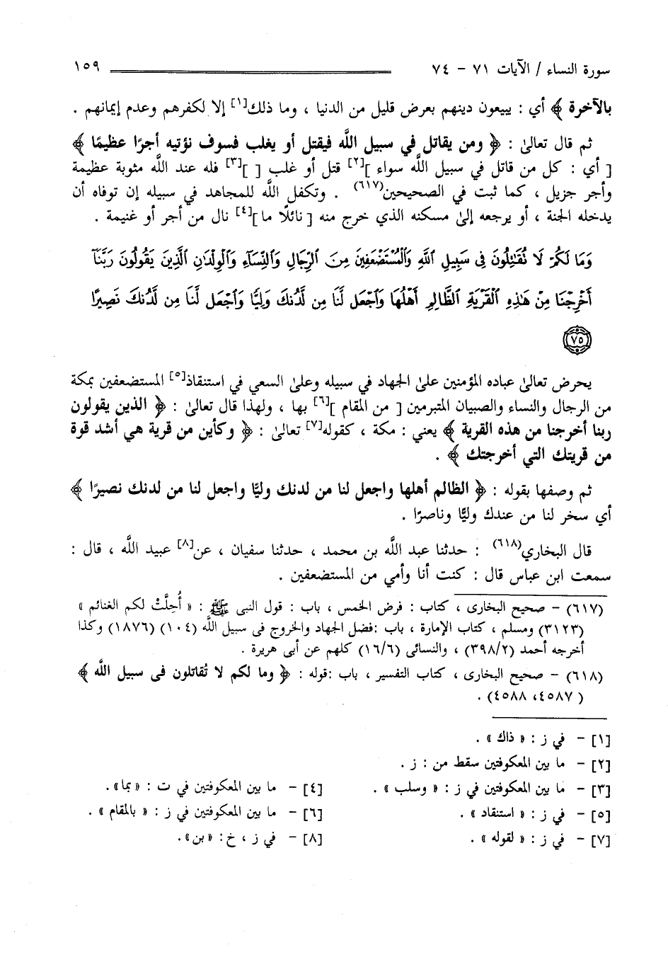 يُحَرِّض تَعَالَى عِبَاده الْمُؤْمِنِينَ عَلَى الْجِهَاد فِي سَبِيله وَعَلَى السَّعْي فِي اِسْتِنْقَاذ الْمُسْتَضْعَفِينَ بِمَكَّة مِنْ الرِّجَال وَالنِّسَاء وَالصِّبْيَان الْمُتَبَرِّمِينَ مِنْ الْمُقَام بِهَا وَلِهَذَا قَالَ تَعَالَى " الَّذِينَ يَقُولُونَ رَبّنَا أَخْرِجْنَا مِنْ هَذِهِ الْقَرْيَة " يَعْنِي مَكَّة كَقَوْلِهِ تَعَالَى " وَكَأَيِّنْ مِنْ قَرْيَة هِيَ أَشَدّ قُوَّة مِنْ قَرْيَتك الَّتِي أَخْرَجَتْك" ثُمَّ وَصَفَهَا بِقَوْلِهِ " الظَّالِم أَهْلهَا وَاجْعَلْ لَنَا مِنْ لَدُنْك وَلِيًّا وَاجْعَلْ لَنَا مِنْ لَدُنْك نَصِيرًا أَيْ سَخِّرْ لَنَا مِنْ عِنْدك وَلِيًّا نَاصِرًا .