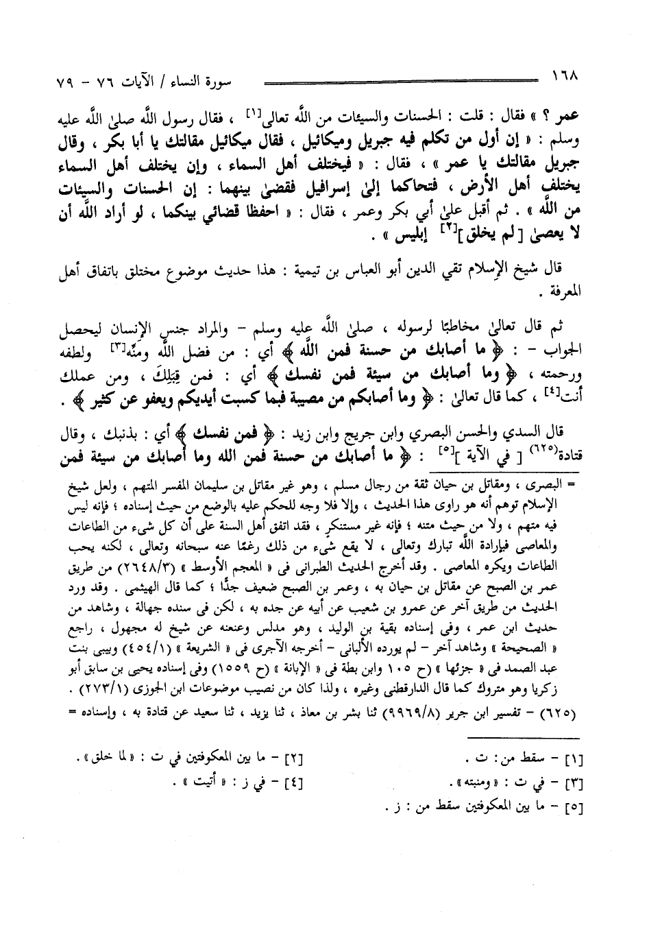 عُمَر : فَقَالَ : قُلْت الْحَسَنَات وَالسَّيِّئَات مِنْ اللَّه.