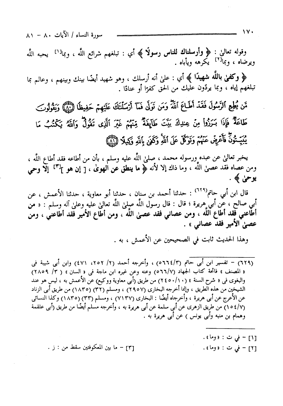 مَنْ يُطِعِ الرَّسُولَ فَقَدْ أَطَاعَ اللَّهَ وَمَنْ تَوَلَّى فَمَا أَرْسَلْنَاكَ عَلَيْهِمْ حَفِيظًا