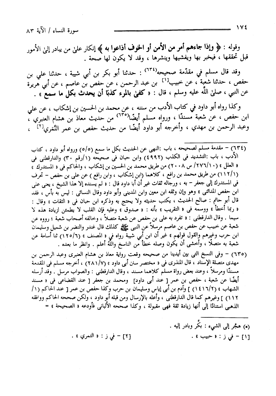 وَقَدْ قَالَ مُسْلِم فِي مُقَدِّمَة صَحِيحه : حَدَّثَنَا أَبُو بَكْر بْن أَبِي شَيْبَة حَدَّثَنَا عَلِيّ بْن حَفْص حَدَّثَنَا شُعْبَة عَنْ حَبِيب بْن عَبْد الرَّحْمَن عَنْ حَفْص بْن عَاصِم عَنْ أَبِي هُرَيْرَة عَنْ النَّبِيّ صَلَّى اللَّه عَلَيْهِ وَسَلَّمَ قَالَ " كَفَى بِالْمَرْءِ كَذِبًا أَنْ يُحَدِّث بِكُلِّ مَا سَمِعَ " وَكَذَا رَوَاهُ أَبُو دَاوُد فِي كِتَاب الْأَدَب مِنْ سُنَنه عَنْ مُحَمَّد بْن الْحُسَيْن بْن أَشْكَاب عَنْ عَلِيّ بْن حَفْص عَنْ شُعْبَة مُسْنَدًا وَرَوَاهُ مُسْلِم أَيْضًا مِنْ حَدِيث مُعَاذ بْن هِشَام الْعَنْبَرِيّ وَعَبْد الرَّحْمَن بْن مَهْدِيّ وَأَخْرَجَهُ أَبُو دَاوُد أَيْضًا مِنْ حَدِيث حَفْص بْن عَمْرو النَّمَرِيّ