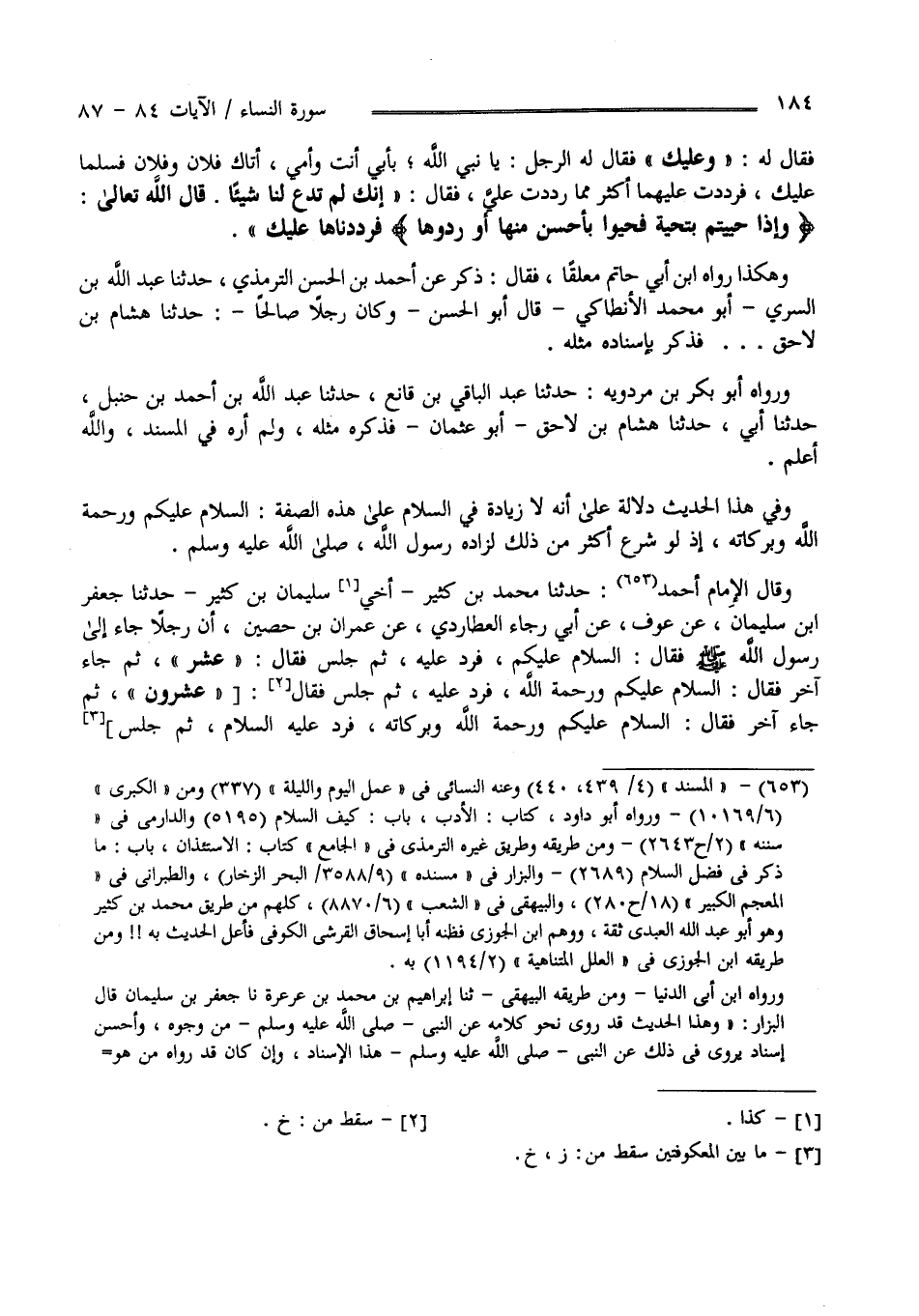 وَقَالَ الْإِمَام أَحْمَد : حَدَّثَنَا مُحَمَّد بْن كَثِير أَخُو سُلَيْمَان بْن كَثِير حَدَّثَنَا جَعْفَر بْن سُلَيْمَان عَنْ عَوْف عَنْ أَبِي رَجَاء الْعُطَارِدِيّ عَنْ عِمْرَان بْن حُصَيْن أَنَّ رَجُلًا جَاءَ إِلَى رَسُول اللَّه صَلَّى اللَّه عَلَيْهِ وَسَلَّمَ فَقَالَ : السَّلَام عَلَيْكُمْ يَا رَسُول اللَّه فَرَدَّ عَلَيْهِ السَّلَام ثُمَّ جَلَسَ فَقَالَ عَشْر ثُمَّ جَاءَ آخَر فَقَالَ : السَّلَام عَلَيْكُمْ وَرَحْمَة اللَّه فَرَدَّ عَلَيْهِ ثُمَّ جَلَسَ فَقَالَ عِشْرُونَ ثُمَّ جَاءَ آخَر فَقَالَ : السَّلَام عَلَيْكُمْ وَرَحْمَة اللَّه وَبَرَكَاته فَرَدَّ عَلَيْهِ السَّلَام ثُمَّ جَلَسَ