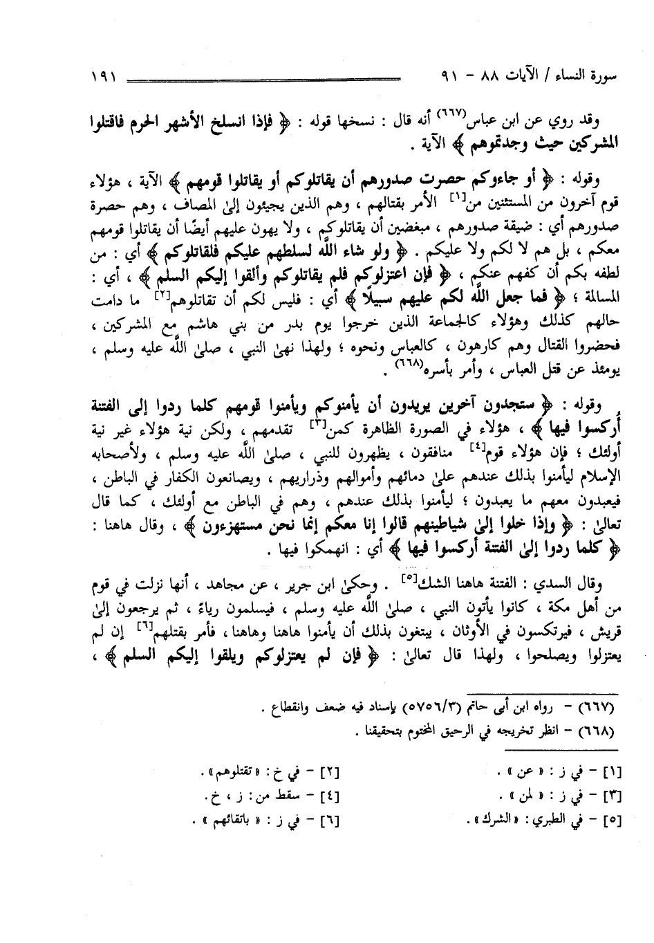 سَتَجِدُونَ آَخَرِينَ يُرِيدُونَ أَنْ يَأْمَنُوكُمْ وَيَأْمَنُوا قَوْمَهُمْ كُلَّ مَا رُدُّوا إِلَى الْفِتْنَةِ أُرْكِسُوا فِيهَا فَإِنْ لَمْ يَعْتَزِلُوكُمْ وَيُلْقُوا إِلَيْكُمُ السَّلَمَ وَيَكُفُّوا أَيْدِيَهُمْ فَخُذُوهُمْ وَاقْتُلُوهُمْ حَيْثُ ثَقِفْتُمُوهُمْ وَأُولَئِكُمْ جَعَلْنَا لَكُمْ عَلَيْهِمْ سُلْطَانًا مُبِينًا (91)