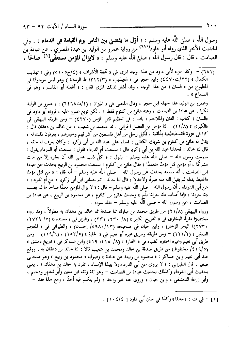 رَسُول اللَّه صَلَّى اللَّه عَلَيْهِ وَسَلَّمَ" أَوَّل مَا يُقْضَى بَيْن النَّاس يَوْم الْقِيَامَة فِي الدِّمَاء " وَفِي الْحَدِيث الْآخَر الَّذِي رَوَاهُ أَبُو دَاوُد مِنْ رِوَايَة عَمْرو بْن الْوَلِيد بْن عُبَيْدَة الْمِصْرِيّ عَنْ عُبَادَة بْن الصَّامِت قَالَ : قَالَ رَسُول اللَّه صَلَّى اللَّه عَلَيْهِ وَسَلَّمَ " لَا يَزَال الْمُؤْمِن مُعْنِقًا صَالِحًا