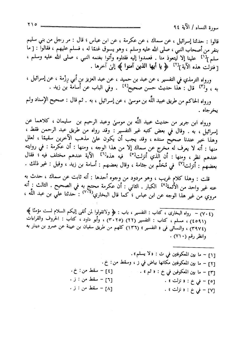 وَقَالَ فِي بَعْض كُتُبه غَيْر التَّفْسِير وَقَدْ رَوَاهُ مِنْ طَرِيق عَبْد الرَّحْمَن فَقَطْ وَهَذَا خَبَر عِنْدنَا صَحِيح سَنَده وَقَدْ يَجِب أَنْ يَكُون عَلَى مَذْهَب الْآخَرِينَ سَقِيمًا لِعِلَلٍ مِنْهَا أَنَّهُ لَا يُعْرَف لَهُ مَخْرَج عَنْ سِمَاك إِلَّا مِنْ هَذَا الْوَجْه وَمِنْهَا أَنَّ عِكْرِمَة فِي رِوَايَته عِنْدهمْ نَظَر وَمِنْهَا أَنَّ الَّذِي نَزَلَتْ فِيهِ هَذِهِ الْآيَة عِنْدهمْ مُخْتَلَف فِيهِ فَقَالَ بَعْضهمْ نَزَلَتْ فِي مُحَلِّم بْن جَثَّامَة وَقَالَ بَعْضهمْ أُسَامَة بْن زَيْد وَقِيلَ : غَيْر ذَلِكَ قُلْت وَهَذَا كَلَام غَرِيب وَهُوَ مَرْدُود مِنْ وُجُوه أَحَدهَا أَنَّهُ ثَابِت عَنْ سِمَاك حَدَّثَ بِهِ عَنْهُ غَيْر وَاحِد مِنْ الْأَئِمَّة الْكِبَار الثَّانِي أَنَّ عِكْرِمَة مُحْتَجّ بِهِ فِي الصَّحِيح الثَّالِث أَنَّهُ مَرْوِيّ مِنْ غَيْر هَذَا الْوَجْه عَنْ اِبْن عَبَّاس كَمَا قَالَ الْبُخَارِيّ حَدَّثَنَا عَلِيّ بْن عَبْد اللَّه