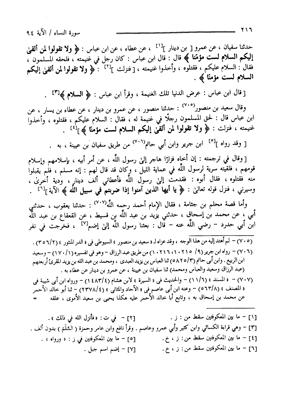حَدَّثَنَا سُفْيَان عَنْ عَمْرو بْن دِينَار عَنْ عَطَاء عَنْ اِبْن عَبَّاس " وَلَا تَقُولُوا لِمَنْ أَلْقَى إِلَيْكُمْ السَّلَام لَسْت مُؤْمِنًا " قَالَ : قَالَ اِبْن عَبَّاس : كَانَ رَجُل فِي غُنَيْمَة لَهُ فَلَحِقَهُ الْمُسْلِمُونَ فَقَالَ السَّلَام عَلَيْكُمْ فَقَتَلُوهُ وَأَخَذُوا غُنَيْمَته فَأَنْزَلَ اللَّه فِي ذَلِكَ " وَلَا تَقُولُوا لِمَنْ أَلْقَى إِلَيْكُمْ السَّلَام لَسْت مُؤْمِنًا " قَالَ اِبْن عَبَّاس عَرَض الدُّنْيَا تِلْكَ الْغُنَيْمَة وَقَرَأَ اِبْن عَبَّاس عَلَيْهِ السَّلَام وَقَالَ سَعِيد بْن مَنْصُور حَدَّثَنَا مَنْصُور عَنْ عَمْرو بْن دِينَار عَنْ عَطَاء بْن يَسَار عَنْ اِبْن عَبَّاس قَالَ : لَحِقَ الْمُسْلِمُونَ رَجُلًا فِي غُنَيْمَة لَهُ فَقَالَ السَّلَام عَلَيْكُمْ فَقَتَلُوهُ وَأَخَذُوا غُنَيْمَته فَنَزَلَتْ " وَلَا تَقُولُوا لِمَنْ أَلْقَى إِلَيْكُمْ السَّلَام لَسْت مُؤْمِنًا " وَقَدْ رَوَاهُ اِبْن جَرِير وَابْن أَبِي حَاتِم مِنْ طَرِيق سُفْيَان بْن عُيَيْنَة بِهِ وَقَدْ قَالَ فِي تَرْجَمَة : إِنَّ أَخَاهُ فَزَارًا هَاجَرَ إِلَى رَسُول اللَّه صَلَّى اللَّه عَلَيْهِ وَسَلَّمَ عَنْ أَمْر أَبِيهِ بِإِسْلَامِهِمْ وَإِسْلَام قَوْمهمْ فَلَقِيَتْهُ سَرِيَّة لِرَسُولِ اللَّه صَلَّى اللَّه عَلَيْهِ وَسَلَّمَ فِي عِمَايَة اللَّيْل وَكَانَ قَدْ قَالَ لَهُمْ إِنَّهُ مُسْلِم فَلَمْ يَقْبَلُوا مِنْهُ فَقَتَلُوهُ فَقَالَ أَبُوهُ فَقَدِمْت عَلَى رَسُول اللَّه صَلَّى اللَّه عَلَيْهِ وَسَلَّمَ فَأَعْطَانِي أَلْف دِينَار وَدِيَة أُخْرَى وَسَيَّرَنِي فَنَزَلَ قَوْله تَعَالَى " يَا أَيّهَا الَّذِينَ آمَنُوا إِذَا ضَرَبْتُمْ فِي سَبِيل اللَّه " الْآيَة .