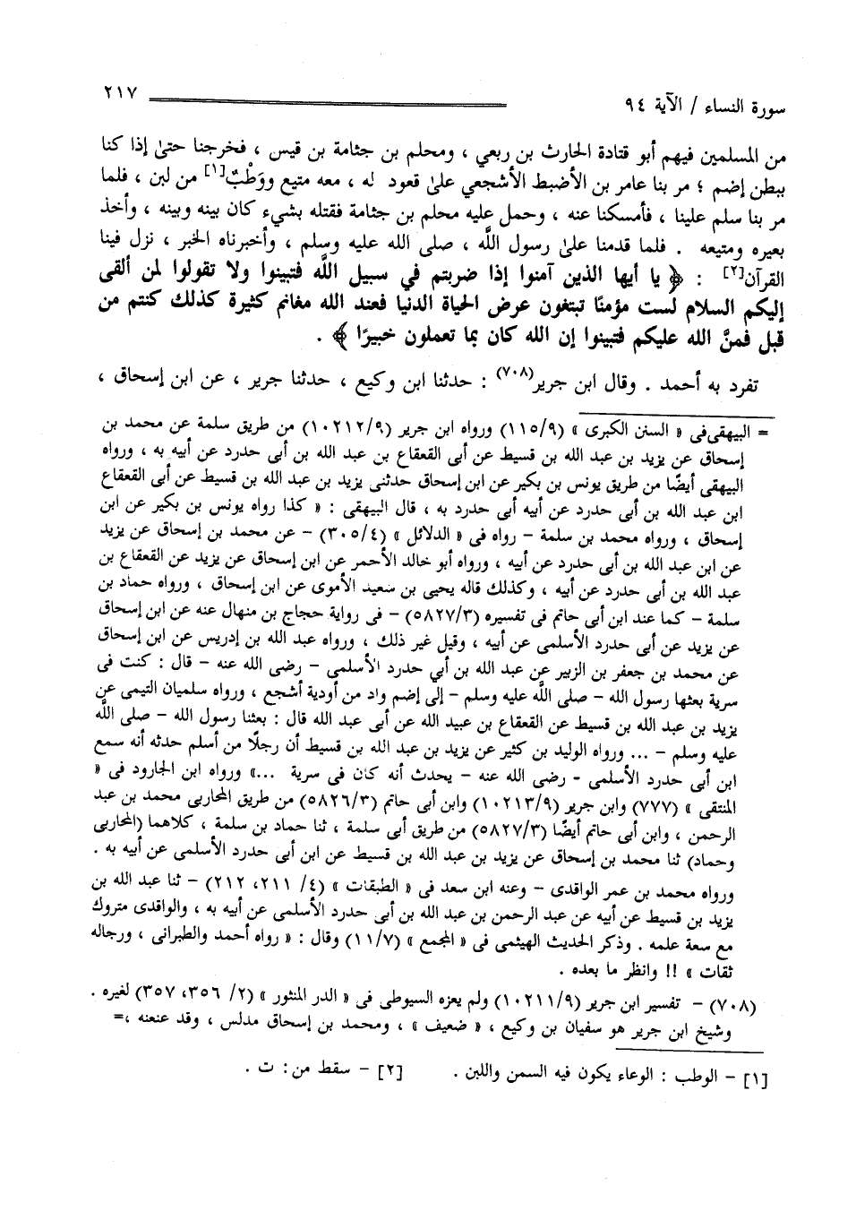 فَلَمَّا قَدِمْنَا عَلَى رَسُول اللَّه صَلَّى اللَّه عَلَيْهِ وَسَلَّمَ وَأَخْبَرْنَاهُ الْخَبَر نَزَلَ فِينَا " يَا أَيّهَا الَّذِينَ آمَنُوا إِذَا ضَرَبْتُمْ فِي سَبِيل اللَّه - إِلَى قَوْله تَعَالَى - خَبِيرًا " تَفَرَّدَ بِهِ أَحْمَد .