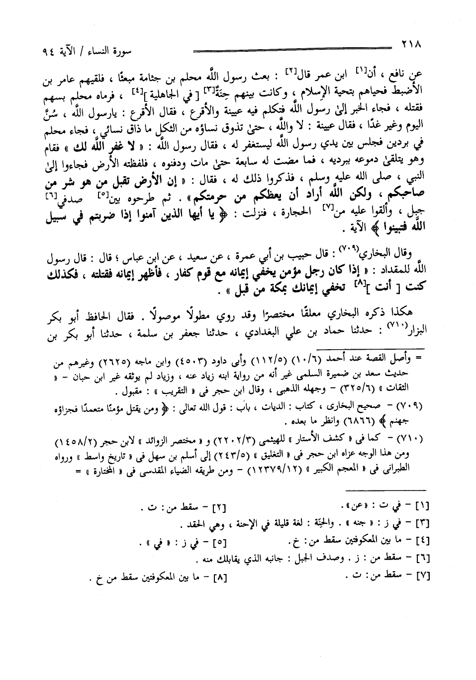 عَنْ نَافِع عَنْ اِبْن عُمَر قَالَ : بَعَثَ رَسُول اللَّه صَلَّى اللَّه عَلَيْهِ وَسَلَّمَ مُحَلَّم بْن جَثَّامَة مَبْعَثًا فَلَقِيَهُمْ عَامِر بْن الْأَضْبَط فَحَيَّاهُمْ بِتَحِيَّةِ الْإِسْلَام وَكَانَتْ بَيْنهمْ إِحْنَة فِي الْجَاهِلِيَّة فَرَمَاهُ مُحَلَّم بِسَهْمٍ فَقَتَلَهُ فَجَاءَ الْخَبَر إِلَى رَسُول اللَّه صَلَّى اللَّه عَلَيْهِ وَسَلَّمَ فَتَكَلَّمَ فِيهِ عُيَيْنَة وَالْأَقْرَع فَقَالَ الْأَقْرَع يَا رَسُول اللَّه سِرْ الْيَوْم وَغِرْ غَدًا فَقَالَ عُيَيْنَة لَا وَاَللَّه حَتَّى تَذُوق نِسَاؤُهُ مِنْ الثُّكْل مَا ذَاقَ نِسَائِي فَجَاءَ مُحَلَّم فِي بُرْدَيْنِ فَجَلَسَ بَيْن يَدَيْ رَسُول اللَّه صَلَّى اللَّه عَلَيْهِ وَسَلَّمَ لِيَسْتَغْفِر لَهُ فَقَالَ رَسُول اللَّه صَلَّى اللَّه عَلَيْهِ وَسَلَّمَ " لَا غَفَرَ اللَّه لَك " فَقَامَ وَهُوَ يَتَلَقَّى دُمُوعه بِبُرْدَيْهِ فَمَا مَضَتْ لَهُ سَابِعَة حَتَّى مَاتَ وَدَفَنُوهُ فَلَفَظَتْهُ الْأَرْض فَجَاءُوا إِلَى النَّبِيّ صَلَّى اللَّه عَلَيْهِ وَسَلَّمَ فَذَكَرُوا ذَلِكَ لَهُ فَقَالَ " إِنَّ الْأَرْض تَقْبَل مَنْ هُوَ شَرّ مِنْ صَاحِبكُمْ وَلَكِنَّ اللَّه أَرَادَ أَنْ يَعِظكُمْ ثُمَّ طَرَحُوهُ بَيْن صَدَفَيْ جَبَل وَأَلْقَوْا عَلَيْهِ الْحِجَارَة فَنَزَلَتْ " يَا أَيّهَا الَّذِينَ آمَنُوا إِذَا ضَرَبْتُمْ فِي سَبِيل اللَّه فَتَبَيَّنُوا " الْآيَة وَقَالَ الْبُخَارِيّ قَالَ حَبِيب بْن أَبِي عَمْرَة عَنْ سَعِيد عَنْ اِبْن عَبَّاس قَالَ : قَالَ رَسُول اللَّه صَلَّى اللَّه عَلَيْهِ وَسَلَّمَ لِلْمِقْدَادِ " إِذَا كَانَ رَجُل مُؤْمِن يُخْفِي إِيمَانه مَعَ قَوْم كُفَّار فَأَظْهَرَ إِيمَانه فَقَتَلَتْه فَكَذَلِكَ كُنْت تُخْفِي إِيمَانك بِمَكَّة مِنْ قَبْل " هَكَذَا ذَكَرَهُ الْبُخَارِيّ مُعَلَّقًا مُخْتَصَرًا وَقَدْ رُوِيَ مُطَوَّلًا مَوْصُولًا .