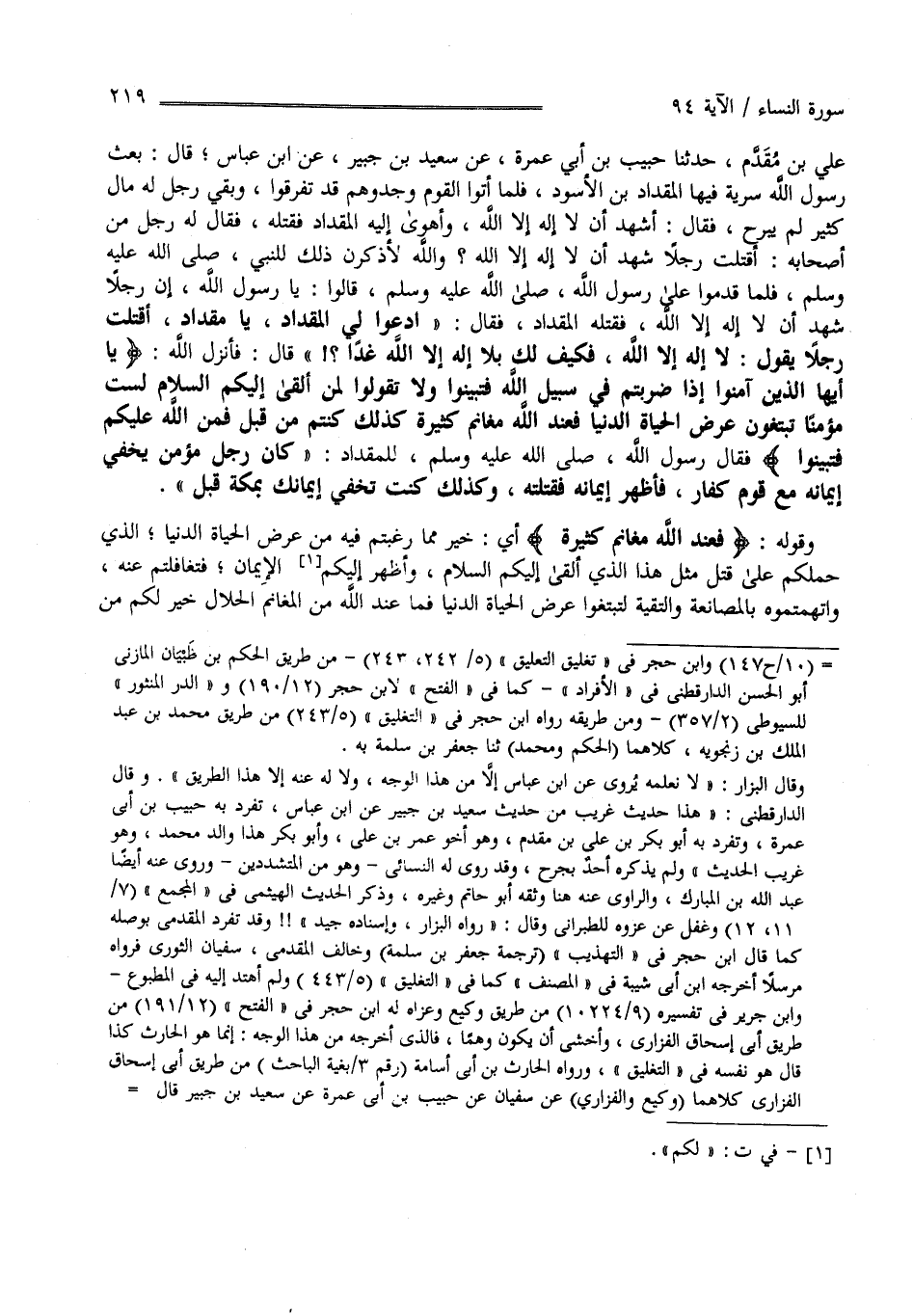 عَلِيّ بْن مُقَدَّم حَدَّثَنَا حَبِيب بْن أَبِي عَمْرَة عَنْ سَعِيد بْن جُبَيْر عَنْ اِبْن عَبَّاس قَالَ : بَعَثَ رَسُول اللَّه صَلَّى اللَّه عَلَيْهِ وَسَلَّمَ سَرِيَّة فِيهَا الْمِقْدَاد بْن الْأَسْوَد فَلَمَّا أَتَوْا الْقَوْم وَجَدُوهُمْ قَدْ تَفَرَّقُوا وَبَقِيَ رَجُل لَهُ مَال كَثِير لَمْ يَبْرَح فَقَالَ أَشْهَد أَنْ لَا إِلَه إِلَّا اللَّه وَأَهْوَى إِلَيْهِ الْمِقْدَاد فَقَتَلَهُ فَقَالَ لَهُ رَجُل مِنْ أَصْحَابه أَقَتَلْت رَجُلًا شَهِدَ أَنْ لَا إِلَه إِلَّا اللَّه ؟ وَاَللَّه لَأَذْكُرَن ذَلِكَ لِلنَّبِيِّ صَلَّى اللَّه عَلَيْهِ وَسَلَّمَ فَلَمَّا قَدِمُوا عَلَى رَسُول اللَّه صَلَّى اللَّه عَلَيْهِ وَسَلَّمَ قَالُوا يَا رَسُول اللَّه إِنَّ رَجُلًا شَهِدَ أَنْ لَا إِلَه إِلَّا اللَّه فَقَتَلَهُ الْمِقْدَاد فَقَالَ " اُدْعُوَا لِي الْمِقْدَاد يَا مِقْدَاد أَقَتَلْت رَجُلًا يَقُول لَا إِلَه إِلَّا اللَّه فَكَيْف لَك بِلَا إِلَه إِلَّا اللَّه غَدًا " قَالَ فَأَنْزَلَ " اللَّه يَا أَيّهَا الَّذِينَ آمَنُوا إِذَا ضَرَبْتُمْ فِي سَبِيل اللَّه فَتَبَيَّنُوا " وَلَا تَقُولُوا لِمَنْ أَلْقَى إِلَيْكُمْ السَّلَام لَسْت مُؤْمِنًا تَبْتَغُونَ عَرَضَ الْحَيَاة الدُّنْيَا فَعِنْد اللَّه مَغَانِم كَثِيرَة كَذَلِكَ كُنْتُمْ مِنْ قَبْل فَمَنَّ اللَّه عَلَيْكُمْ فَتَبَيَّنُوا فَقَالَ رَسُول اللَّه صَلَّى اللَّه عَلَيْهِ وَسَلَّمَ لِلْمِقْدَادِ " كَانَ رَجُل مُؤْمِن يُخْفِي إِيمَانه مَعَ قَوْم كُفَّار فَأَظْهَرَ إِيمَانه فَقَتَلَتْه وَكَذَلِكَ كُنْت تُخْفِي إِيمَانك بِمَكَّة قَبْل " وَقَوْله فَعِنْد اللَّه مَغَانِم كَثِيرَة أَيْ خَيْر مِمَّا رَغِبْتُمْ فِيهِ مِنْ عَرَض الْحَيَاة الدُّنْيَا الَّذِي حَمَلَكُمْ عَلَى قَتْل مِثْل هَذَا الَّذِي أَلْقَى إِلَيْكُمْ السَّلَام وَأَظْهَرَ لَكُمْ الْإِيمَان فَتَغَافَلْتُمْ عَنْهُ وَاتَّهَمْتُمُوهُ بِالْمُصَانَعَةِ وَالتَّقِيَّة لِتَبْتَغُوا عَرَض الْحَيَاة الدُّنْيَا فَمَا عِنْد اللَّه مِنْ الرِّزْق الْحَلَال خَيْر لَكُمْ مِنْ