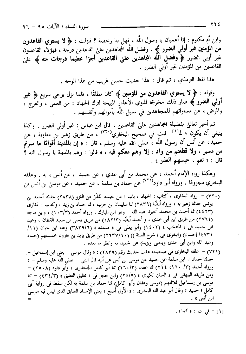 هَذَا لَفْظ التِّرْمِذِيّ ثُمَّ قَالَ هَذَا حَدِيث حَسَن غَرِيب مِنْ هَذَا الْوَجْه فَقَوْله لَا يَسْتَوِي الْقَاعِدُونَ مِنْ الْمُؤْمِنِينَ كَانَ مُطْلَقًا فَلَمَّا نَزَلَ بِوَحْيٍ سَرِيع " غَيْر أُولِي الضَّرَر " صَارَ ذَلِكَ مَخْرَجًا لِذَوِي الْأَعْذَار الْمُبِيحَة لِتَرْكِ الْجِهَاد مِنْ الْعَمَى وَالْعَرَج وَالْمَرْضَى عَنْ مُسَاوَاتهمْ لِلْمُجَاهِدِينَ فِي سَبِيل اللَّه بِأَمْوَالِهِمْ وَأَنْفُسهمْ ثُمَّ أَخْبَرَ تَعَالَى بِفَضِيلَةِ الْمُجَاهِدِينَ عَلَى الْقَاعِدِينَ قَالَ اِبْن عَبَّاس : " غَيْر أُولِي الضَّرَر " وَكَذَا يَنْبَغِي أَنْ يَكُون كَمَا ثَبَتَ فِي صَحِيح الْبُخَارِيّ مِنْ طَرِيق زُهَيْر بْن مُعَاوِيَة عَنْ حُمَيْد عَنْ أَنَس أَنَّ رَسُول اللَّه صَلَّى اللَّه عَلَيْهِ وَسَلَّمَ قَالَ " إِنَّ بِالْمَدِينَةِ أَقْوَامًا مَا سِرْتُمْ مِنْ مَسِير وَلَا قَطَعْتُمْ مِنْ وَادٍ إِلَّا وَهُمْ مَعَكُمْ فِيهِ " قَالُوا وَهُمْ بِالْمَدِينَةِ يَا رَسُول اللَّه ؟ قَالَ " نَعَمْ حَبَسَهُمْ الْعُذْر " وَهَكَذَا رَوَاهُ أَحْمَد عَنْ مُحَمَّد بْن عَدِيّ عَنْ حُمَيْد عَنْ أَنَس بِهِ وَعَلَّقَهُ الْبُخَارِيّ مَجْزُومًا وَرَوَاهُ أَبُو دَاوُد عَنْ حَمَّاد بْن سَلَمَة عَنْ حُمَيْد عَنْ مُوسَى بْن أَنَس بْن