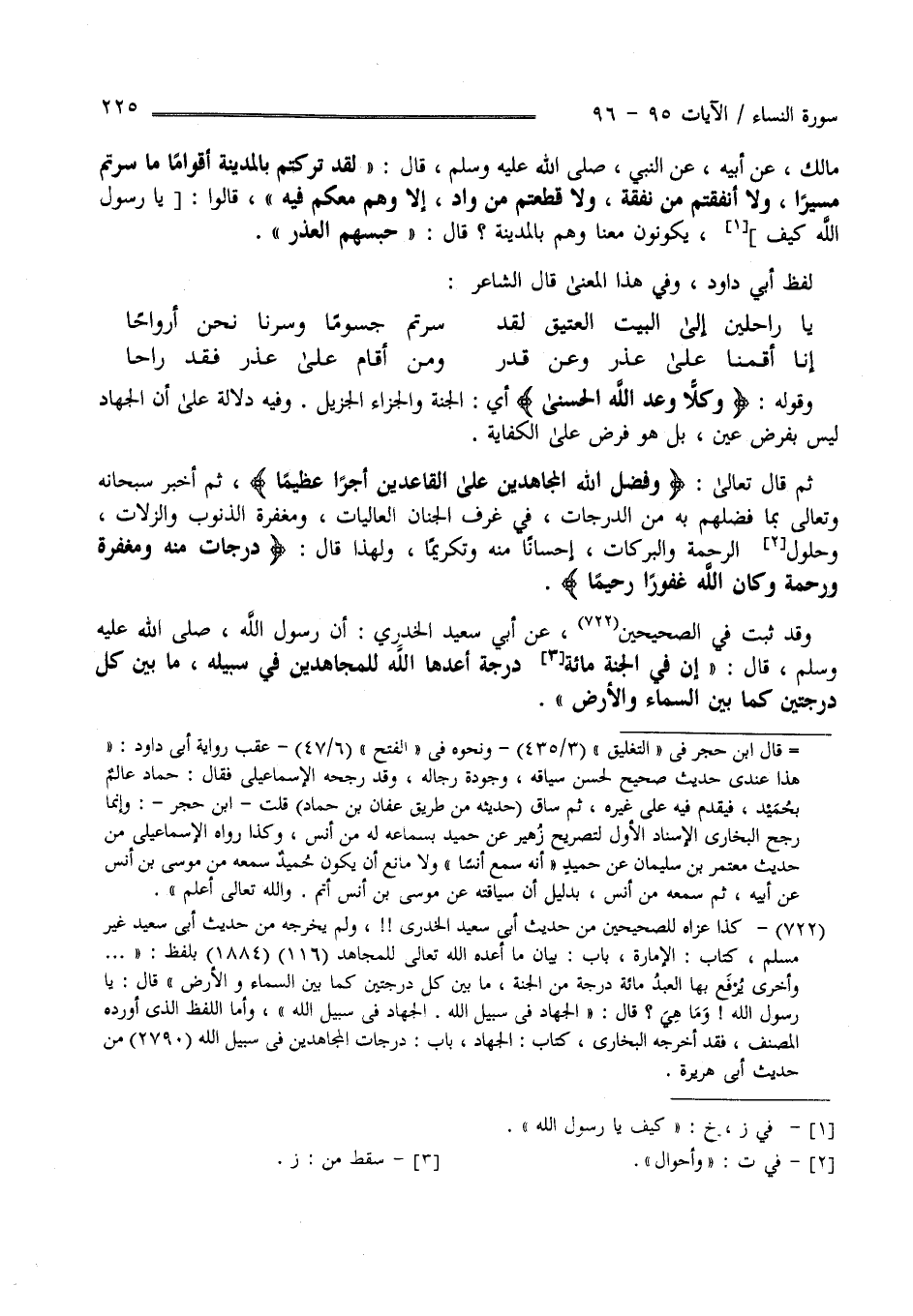 قَالَ تَعَالَى " وَفَضَّلَ اللَّه الْمُجَاهِدِينَ عَلَى الْقَاعِدِينَ أَجْرًا عَظِيمًا " ثُمَّ أَخْبَرَ سُبْحَانه بِمَا فَضَّلَهُمْ بِهِ مِنْ الدَّرَجَات فِي غُرَف الْجِنَان الْعَالِيَات وَمَغْفِرَة الذُّنُوب وَالزَّلَّات وَأَحْوَال الرَّحْمَة وَالْبَرَكَات إِحْسَانًا مِنْهُ وَتَكْرِيمًا .