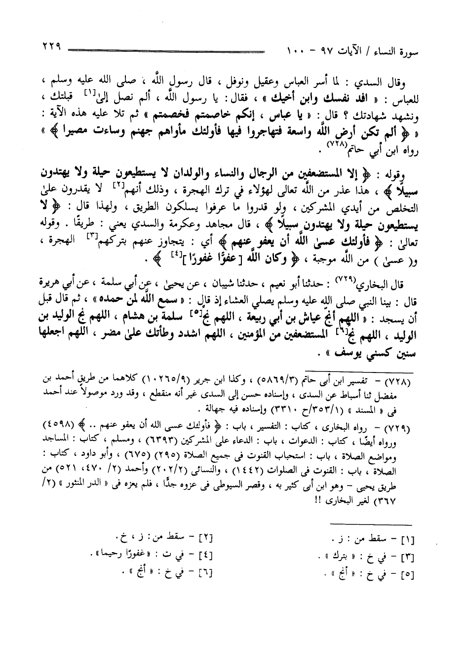 وَقَوْله تَعَالَى " فَأُولَئِكَ عَسَى اللَّه أَنْ يَعْفُو عَنْهُمْ " أَيْ يَتَجَاوَز عَنْهُمْ بِتَرْكِ الْهِجْرَة وَعَسَى مِنْ اللَّه مُوجِبَة " وَكَانَ اللَّه غَفُورًا رَحِيمًا قَالَ الْبُخَارِيّ : حَدَّثَنَا أَبُو نُعَيْم حَدَّثَنَا شَيْبَان عَنْ يَحْيَى عَنْ أَبِي سَلَمَة عَنْ أَبِي هُرَيْرَة قَالَ : بَيْنَا رَسُول اللَّه صَلَّى اللَّه عَلَيْهِ وَسَلَّمَ يُصَلِّي الْعِشَاء إِذْ قَالَ " سَمِعَ اللَّه لِمَنْ حَمِدَهُ " ثُمَّ قَالَ قَبْل أَنْ يَسْجُد " اللَّهُمَّ أَنْجِ عَيَّاش بْن أَبِي رَبِيعَة اللَّهُمَّ أَنْجِ سَلَمَة بْن هِشَام اللَّهُمَّ أَنْجِ الْوَلِيد بْن الْوَلِيد اللَّهُمَّ أَنْجِ الْمُسْتَضْعَفِينَ مِنْ الْمُؤْمِنِينَ اللَّهُمَّ اُشْدُدْ وَطْأَتك عَلَى مُضَر اللَّهُمَّ اِجْعَلْهَا عَلَيْهِمْ سِنِينَ كَسِنِي يُوسُف "
