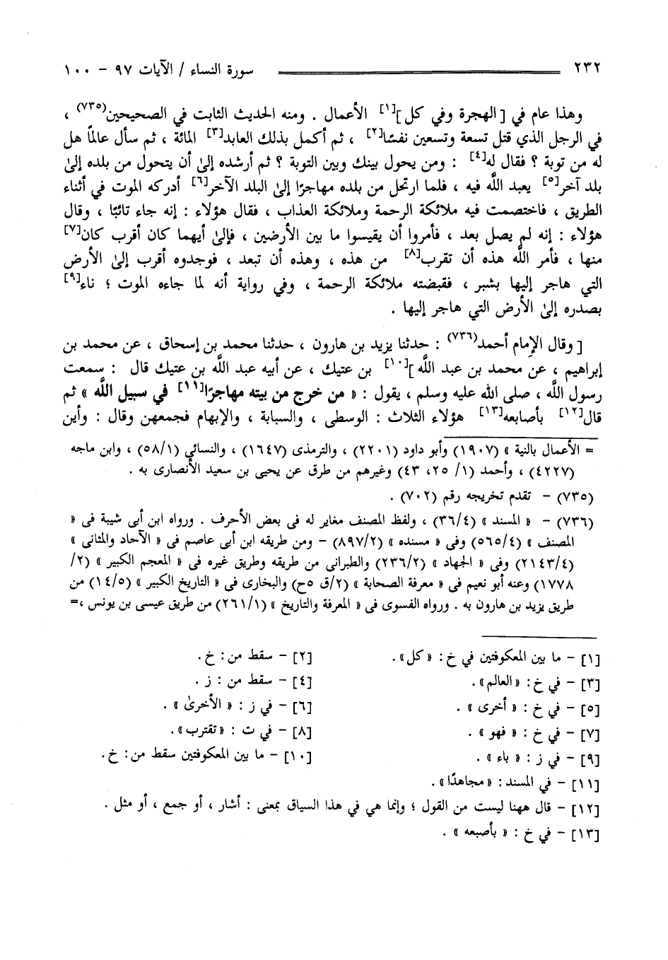 وَهَذَا عَامّ فِي الْهِجْرَة وَفِي جَمِيع الْأَعْمَال وَمِنْهُ الْحَدِيث الثَّابِت فِي الصَّحِيحَيْنِ فِي الرَّجُل الَّذِي قَتَلَ تِسْعَة وَتِسْعِينَ نَفْسًا ثُمَّ أَكْمَلَ بِذَلِكَ الْعَابِد الْمِائَة ثُمَّ سَأَلَ عَالِمًا هَلْ لَهُ مِنْ تَوْبَة فَقَالَ لَهُ وَمَنْ يَحُول بَيْنك وَبَيْن التَّوْبَة ؟ ثُمَّ أَرْشَدَهُ إِلَى أَنْ يَتَحَوَّل مِنْ بَلَده إِلَى بَلَد أُخْرَى يَعْبُد اللَّه فِيهِ فَلَمَّا اِرْتَحَلَ مِنْ بَلَده مُهَاجِرًا إِلَى الْبَلَد الْأُخْرَى أَدْرَكَهُ الْمَوْت فِي أَثْنَاء الطَّرِيق فَاخْتَصَمَتْ فِيهِ مَلَائِكَة الرَّحْمَة وَمَلَائِكَة الْعَذَاب فَقَالَ هَؤُلَاءِ إِنَّهُ جَاءَ تَائِبًا وَقَالَ هَؤُلَاءِ إِنَّهُ لَمْ يَصِلْ بَعْد فَأُمِرُوا أَنْ يَقِيسُوا مَا بَيْن الْأَرْضَيْنِ فَإِلَى أَيّهمَا كَانَ أَقْرَب فَهُوَ مِنْهَا فَأَمَرَ اللَّه هَذِهِ أَنْ تَقْتَرِب مِنْ هَذِهِ وَهَذِهِ أَنْ تَبْعُد فَوَجَدُوهُ أَقْرَب إِلَى الْأَرْض الَّتِي هَاجَرَ إِلَيْهَا بِشِبْرٍ فَقَبَضَتْهُ مَلَائِكَة الرَّحْمَة وَفِي رِوَايَة أَنَّهُ لَمَّا جَاءَهُ الْمَوْت نَاءَ بِصَدْرِهِ إِلَى الْأَرْض الَّتِي هَاجَرَ إِلَيْهَا .