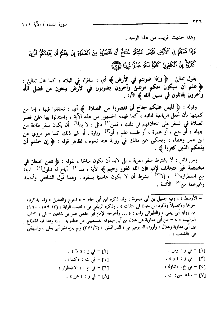ضَرَبْتُمْ فِي الْأَرْض فَلَيْسَ عَلَيْكُمْ جُنَاح أَنْ تَقْصُرُوا مِنْ الصَّلَاة إِنْ خِفْتُمْ أَنْ يَفْتِنكُمْ الَّذِينَ كَفَرُوا إِنَّ الْكَافِرِينَ كَانُوا لَكُمْ عَدُوًّا مُبِينًا " يَقُول تَعَالَى " وَإِذَا ضَرَبْتُمْ فِي الْأَرْض " أَيْ سَافَرْتُمْ فِي الْبِلَاد كَمَا قَالَ تَعَالَى " عَلِمَ أَنْ سَيَكُونُ مِنْكُمْ مَرْضَى وَآخَرُونَ يَضْرِبُونَ فِي الْأَرْض يَبْتَغُونَ مِنْ فَضْل اللَّه " الْآيَة وَقَوْله " فَلَيْسَ عَلَيْكُمْ جُنَاح أَنْ تَقْصُرُوا مِنْ الصَّلَاة " أَيْ تُخَفِّفُوا فِيهَا إِمَّا مِنْ كَمِّيَّتهَا بِأَنْ تُجْعَل الرُّبَاعِيَّة ثُنَائِيَّة كَمَا فَهِمَهُ الْجُمْهُور مِنْ هَذِهِ الْآيَة وَاسْتَدَلُّوا بِهَا عَلَى قَصْر الصَّلَاة فِي السَّفَر عَلَى اِخْتِلَافهمْ فِي ذَلِكَ فَمِنْ قَائِل لَا بُدّ أَنْ يَكُون سَفَر طَاعَة مِنْ جِهَاد أَوْ حَجّ أَوْ عُمْرَة أَوْ طَلَب عِلْم أَوْ زِيَارَة أَوْ غَيْر ذَلِكَ كَمَا هُوَ مَرْوِيّ عَنْ اِبْن عُمَر وَعَطَاء وَيَحْيَى عَنْ مَالِك فِي رِوَايَة عَنْهُ نَحْوه لِظَاهِرِ قَوْله " إِنْ خِفْتُمْ أَنْ يَفْتِنكُمْ الَّذِينَ كَفَرُوا " وَمِنْ قَائِل لَا يُشْتَرَط سَفَر الْقُرْبَة بَلْ لَا بُدّ أَنْ يَكُون مُبَاحًا لِقَوْلِهِ " فَمَنْ اُضْطُرَّ فِي مَخْمَصَة غَيْر مُتَجَانِف لِإِثْمٍ " الْآيَة كَمَا أَبَاحَ لَهُ تَنَاوُل الْمَيْتَة مَعَ الِاضْطِرَار بِشَرْطِ أَنْ لَا يَكُون عَاصِيًا بِسَفَرِهِ وَهَذَا قَوْل الشَّافِعِيّ وَأَحْمَد وَغَيْرهمَا مِنْ الْأَئِمَّة
