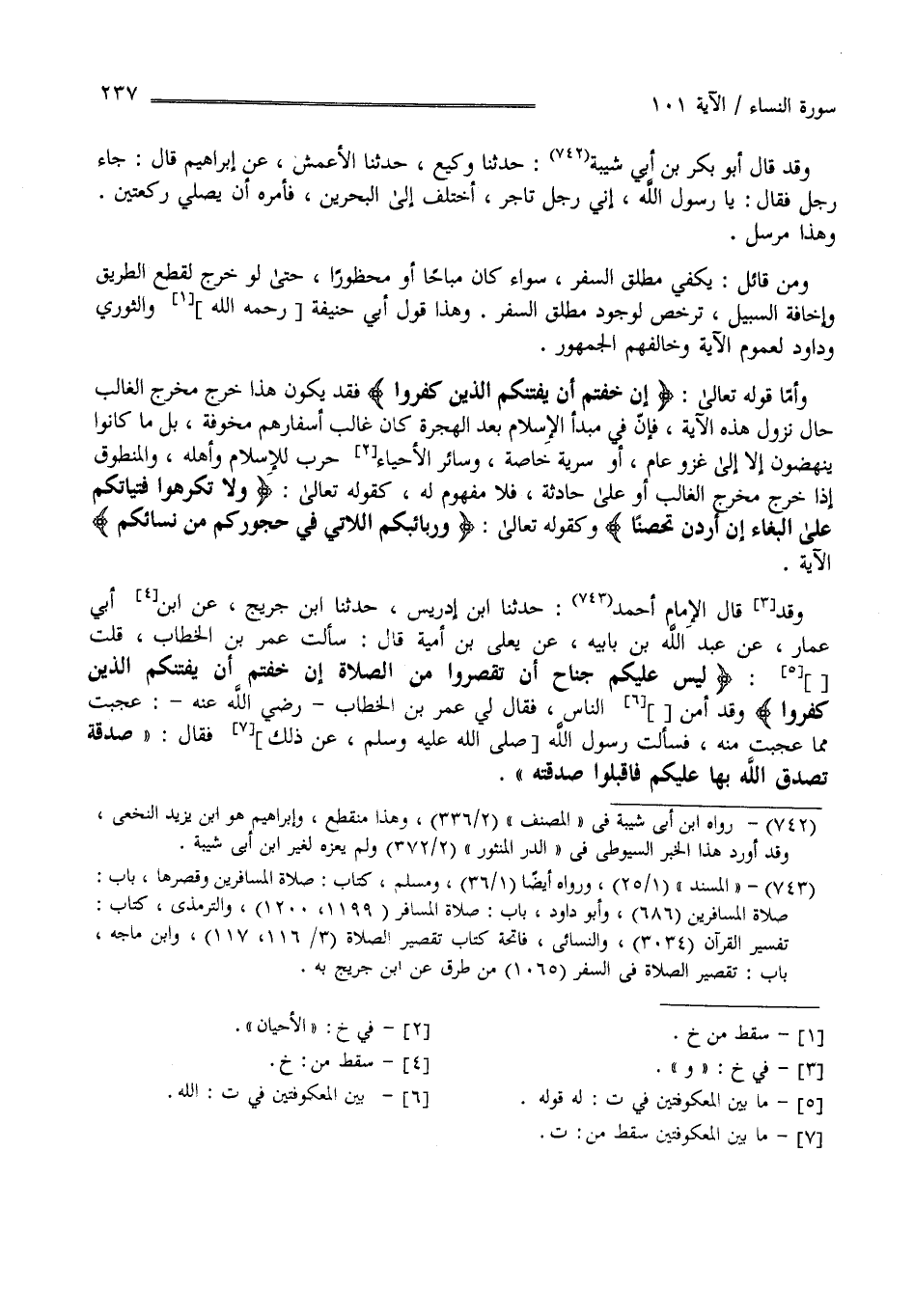 وَمِنْ قَائِل يَكْفِي مُطْلَق السَّفَر سَوَاء كَانَ مُبَاحًا أَوْ مَحْظُورًا حَتَّى لَوْ خَرَجَ لَقَطَعَ الطَّرِيق وَإِخَافَة السَّبِيل تَرَخَّصَ لِوُجُودِ مُطْلَق السَّفَر وَهَذَا قَوْل أَبِي حَنِيفَة وَالثَّوْرِيّ وَدَاوُد لِعُمُومِ الْآيَة وَخَالَفَهُمْ الْجُمْهُور وَأَمَّا قَوْله تَعَالَى " إِنْ خِفْتُمْ أَنْ يَفْتِنكُمْ الَّذِينَ كَفَرُوا " فَقَدْ يَكُون هَذَا خَرَجَ مَخْرَج الْغَالِب حَال نُزُول هَذِهِ الْآيَة فَإِنَّ فِي مَبْدَأ الْإِسْلَام بَعْد الْهِجْرَة كَانَ غَالِب أَسْفَارهمْ مَخُوفَة بَلْ مَا كَانُوا يَنْهَضُونَ إِلَّا إِلَى غَزْو عَامّ أَوْ فِي سَرِيَّة خَاصَّة .