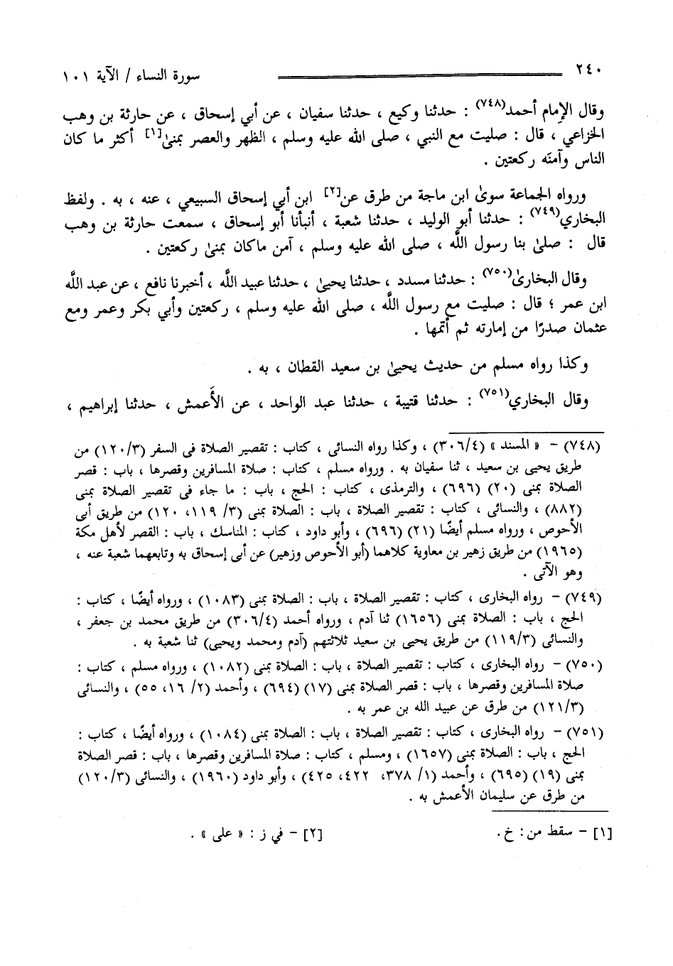 وَقَالَ الْإِمَام أَحْمَد حَدَّثَنَا وَكِيع حَدَّثَنَا سُفْيَان عَنْ أَبِي إِسْحَاق عَنْ حَارِثَة بْن وَهْب الْخُزَاعِيّ قَالَ : صَلَّيْت مَعَ النَّبِيّ صَلَّى اللَّه عَلَيْهِ وَسَلَّمَ الظُّهْر وَالْعَصْر بِمِنًى أَكْثَر مَا كَانَ النَّاس وَآمَنه رَكْعَتَيْنِ .