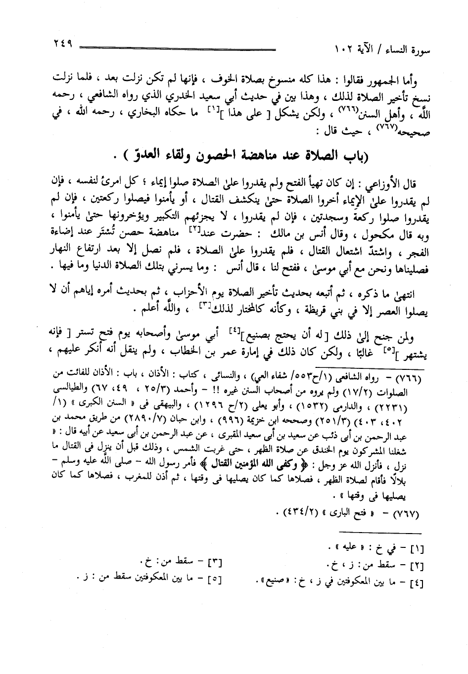 وَأَمَّا الْجُمْهُور فَقَالُوا هَذَا كُلّه مَنْسُوخ بِصَلَاةِ الْخَوْف فَإِنَّهَا لَمْ تَكُنْ نَزَلَتْ بَعْد فَلَمَّا نَزَلَتْ نُسِخَ تَأْخِير الصَّلَاة لِذَلِكَ وَهَذَا أَبْيَن فِي حَدِيث أَبِي سَعِيد الْخُدْرِيّ الَّذِي رَوَاهُ الشَّافِعِيّ رَحِمَهُ اللَّه وَأَهْل السُّنَن وَلَكِنْ يُشْكِل عَلَيْهِ مَا حَكَاهُ الْبُخَارِيّ فِي صَحِيحه حَيْثُ قَالَ " بَاب الصَّلَاة عِنْد مُنَاهَضَة الْحُصُون وَلِقَاء الْعَدُوّ " قَالَ الْأَوْزَاعِيّ إِنْ كَانَ تَهَيَّأَ الْفَتْح وَلَمْ يَقْدِرُوا عَلَى الصَّلَاة صَلَّوْا إِيمَاء كُلّ اِمْرِئٍ لِنَفْسِهِ فَإِنْ لَمْ يَقْدِرُوا عَلَى الْإِيمَاء أَخَّرُوا الصَّلَاة حَتَّى يَنْكَشِف الْقِتَال أَوْ يَأْمَنُوا فَيُصَلُّوا رَكْعَتَيْنِ فَإِنْ لَمْ يَقْدِرُوا صَلَّوْا رَكْعَة وَسَجْدَتَيْنِ فَإِنْ لَمْ يَقْدِرُوا فَلَا يُجْزِيهِمْ التَّكْبِير وَيُؤَخِّرُونَهَا حَتَّى يَأْمَنُوا وَبِهِ قَالَ مَكْحُول وَقَالَ أَنَس بْن مَالِك : حَضَرْت عِنْد مُنَاهَضَة حِصْن تُسْتَر عِنْد إِضَاءَة الْفَجْر وَاشْتَدَّ اِشْتِعَال الْقِتَال فَلَمْ يَقْدِرُوا عَلَى الصَّلَاة فَلَمْ نُصَلِّ إِلَّا بَعْد اِرْتِفَاع النَّهَار فَصَلَّيْنَاهَا وَنَحْنُ مَعَ أَبِي مُوسَى فَفُتِحَ لَنَا قَالَ أَنَس : وَمَا يَسُرّنِي بِتِلْكَ الصَّلَاة الدُّنْيَا وَمَا فِيهَا اِنْتَهَى مَا ذَكَرَهُ ثُمَّ أَتْبَعَهُ بِحَدِيثِ تَأْخِير الصَّلَاة يَوْم الْأَحْزَاب ثُمَّ بِحَدِيثِ أَمْره إِيَّاهُمْ أَنْ لَا يُصَلُّوا الْعَصْر إِلَّا فِي بَنِي قُرَيْظَة وَكَأَنَّهُ الْمُخْتَار لِذَلِكَ وَاَللَّه أَعْلَم .