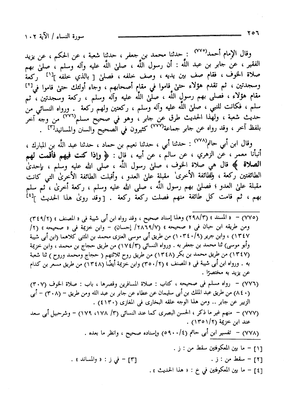 وَقَالَ اِبْن أَبِي حَاتِم حَدَّثَنَا أَبِي حَدَّثَنَا نُعَيْم بْن حَمَّاد حَدَّثَنَا عَبْد اللَّه بْن الْمُبَارَك أَنْبَأَنَا مَعْمَر عَنْ الزُّهْرِيّ عَنْ سَالِم عَنْ أَبِيهِ قَالَ " وَإِذَا كُنْت فِيهِمْ فَأَقَمْت لَهُمْ الصَّلَاة " قَالَ هِيَ صَلَاة الْخَوْف صَلَّى رَسُول اللَّه صَلَّى اللَّه عَلَيْهِ وَسَلَّمَ بِإِحْدَى الطَّائِفَتَيْنِ رَكْعَة وَالطَّائِفَة الْأُخْرَى مُقْبِلَة عَلَى الْعَدُوّ وَأَقْبَلَتْ الطَّائِفَة الْأُخْرَى الَّتِي كَانَتْ مُقْبِلَة عَلَى الْعَدُوّ فَصَلَّى بِهِمْ رَسُول اللَّه صَلَّى اللَّه عَلَيْهِ وَسَلَّمَ رَكْعَة أُخْرَى ثُمَّ سَلَّمَ بِهِمْ ثُمَّ قَامَتْ كُلّ طَائِفَة مِنْهُمْ فَصَلَّتْ رَكْعَة رَكْعَة وَهَذَا الْحَدِيث رَوَاهُ