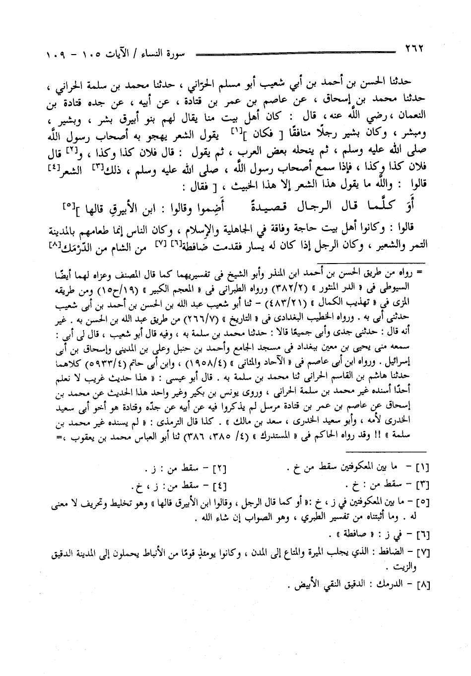 حَدَّثَنَا الْحَسَن بْن أَحْمَد بْن أَبِي شُعَيْب أَبُو مُسْلِم الْحَرَّانِيّ حَدَّثَنَا مُحَمَّد بْن سَلَمَة الْحَرَّانِيّ حَدَّثَنَا مُحَمَّد بْن إِسْحَاق عَنْ عَاصِم بْن عُمَر بْن قَتَادَة عَنْ أَبِيهِ عَنْ جَدّه قَتَادَة بْن النُّعْمَان رَضِيَ اللَّه عَنْهُ قَالَ : كَانَ أَهْل بَيْت مِنَّا يُقَال لَهُمْ بَنُو أُبَيْرِق بِشْر وَبَشِير وَمُبَشِّر وَكَانَ بَشِير رَجُلًا مُنَافِقًا يَقُول الشِّعْر يَهْجُو بِهِ أَصْحَاب رَسُول اللَّه صَلَّى اللَّه عَلَيْهِ وَسَلَّمَ ثُمَّ يَنْحَلهُ لِبَعْضِ الْعَرَب ثُمَّ يَقُول : قَالَ فُلَان كَذَا وَكَذَا وَقَالَ فُلَان كَذَا وَكَذَا فَإِذَا سَمِعَ أَصْحَاب رَسُول اللَّه صَلَّى اللَّه عَلَيْهِ وَسَلَّمَ ذَلِكَ الشِّعْر قَالُوا : وَاَللَّه مَا يَقُول هَذَا الشِّعْر إِلَّا هَذَا الرَّجُل الْخَبِيث أَوْ كَمَا قَالَ الرَّجُل وَقَالُوا اِبْن الْأُبَيْرِق قَالَهَا قَالُوا وَكَانُوا أَهْل بَيْت حَاجَة وَفَاقَة فِي الْجَاهِلِيَّة وَالْإِسْلَام وَكَانَ النَّاس إِنَّمَا طَعَامهمْ بِالْمَدِينَةِ التَّمْر وَالشَّعِير وَكَانَ الرَّجُل إِذَا كَانَ لَهُ يَسَار فَقَدِمَتْ ضَافِطَة مِنْ الشَّام مِنْ الدَّرْمَك
