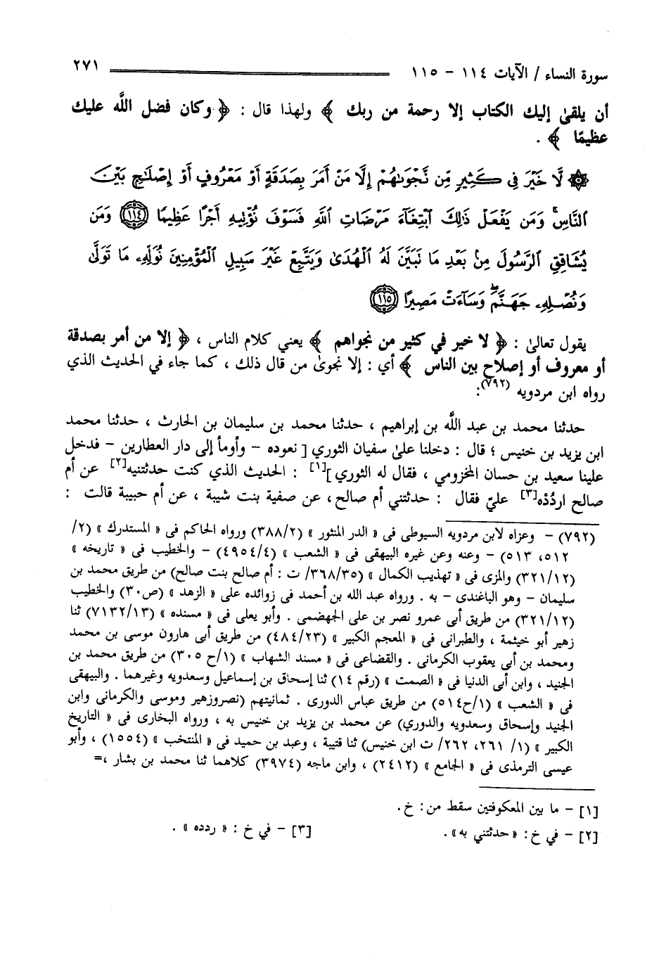 يَقُول تَعَالَى " لَا خَيْر فِي كَثِير مِنْ نَجْوَاهُمْ " يَعْنِي كَلَام النَّاس " إِلَّا مَنْ أَمَرَ بِصَدَقَةٍ أَوْ مَعْرُوف أَوْ إِصْلَاح بَيْن النَّاس " أَيْ إِلَّا نَجْوَى مَنْ قَالَ ذَلِكَ كَمَا جَاءَ فِي الْحَدِيث الَّذِي رَوَاهُ اِبْن مَرْدَوَيْهِ حَدَّثَنَا مُحَمَّد بْن عَبْد اللَّه بْن إِبْرَاهِيم حَدَّثَنَا مُحَمَّد بْن سُلَيْمَان بْن الْحَارِث حَدَّثَنَا مُحَمَّد بْن زَيْد بْن حُنَيْش قَالَ : دَخَلْنَا عَلَى سُفْيَان الثَّوْرِيّ نَعُودهُ فَدَخَلَ عَلَيْنَا سَعِيد بْن حَسَّان فَقَالَ لَهُ الثَّوْرِيّ الْحَدِيث الَّذِي كُنْت حَدَّثْتنِيهِ عَنْ أُمّ صَالِح رَدَّدَهُ عَلِيّ فَقَالَ : حَدَّثَتْنِي أُمّ صَالِح عَنْ صَفِيَّة بِنْت شَيْبَة عَنْ أُمّ حَبِيبَة قَالَتْ :