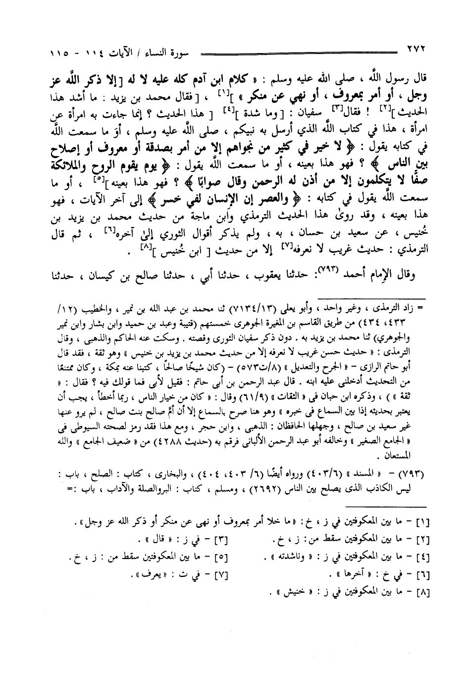 قَالَ رَسُول اللَّه صَلَّى اللَّه عَلَيْهِ وَسَلَّمَ " كَلَام اِبْن آدَم كُلّه عَلَيْهِ لَا لَهُ إِلَّا ذِكْر اللَّه عَزَّ وَجَلَّ أَوْ أَمْر بِمَعْرُوفٍ أَوْ نَهْي عَنْ مُنْكَر " فَقَالَ سُفْيَان : أَوَمَا سَمِعْت اللَّه فِي كِتَابه يَقُول " لَا خَيْر فِي كَثِير مِنْ نَجْوَاهُمْ إِلَّا مَنْ أَمَرَ بِصَدَقَةٍ أَوْ مَعْرُوف أَوْ إِصْلَاح بَيْن النَّاس" فَهُوَ هَذَا بِعَيْنِهِ أَوَمَا سَمِعْت اللَّه يَقُول " يَوْم يَقُوم الرُّوح وَالْمَلَائِكَة صَفًّا لَا يَتَكَلَّمُونَ إِلَّا مَنْ أَذِنَ لَهُ الرَّحْمَن وَقَالَ صَوَابًا " فَهُوَ هَذَا بِعَيْنِهِ أَوَمَا سَمِعْت اللَّه يَقُول فِي كِتَابه " وَالْعَصْر إِنَّ الْإِنْسَان لَفِي خُسْر " إِلَخْ فَهُوَ هَذَا بِعَيْنِهِ وَقَدْ رَوَى هَذَا الْحَدِيث التِّرْمِذِيّ وَابْن مَاجَهْ مِنْ حَدِيث مُحَمَّد بْن يَزِيد بْن حُنَيْش عَنْ سَعِيد بْن حَسَّان بِهِ وَلَمْ يَذْكُر أَقْوَال الثَّوْرِيّ إِلَى آخِرهَا ثُمَّ قَالَ التِّرْمِذِيّ حَدِيث غَرِيب لَا يُعْرَف إِلَّا مِنْ حَدِيث اِبْن حُنَيْش قَالَ الْإِمَام أَحْمَد : حَدَّثَنَا يَعْقُوب حَدَّثَنَا أَبِي حَدَّثَنَا صَالِح بْن كَيْسَان حَدَّثَنَا