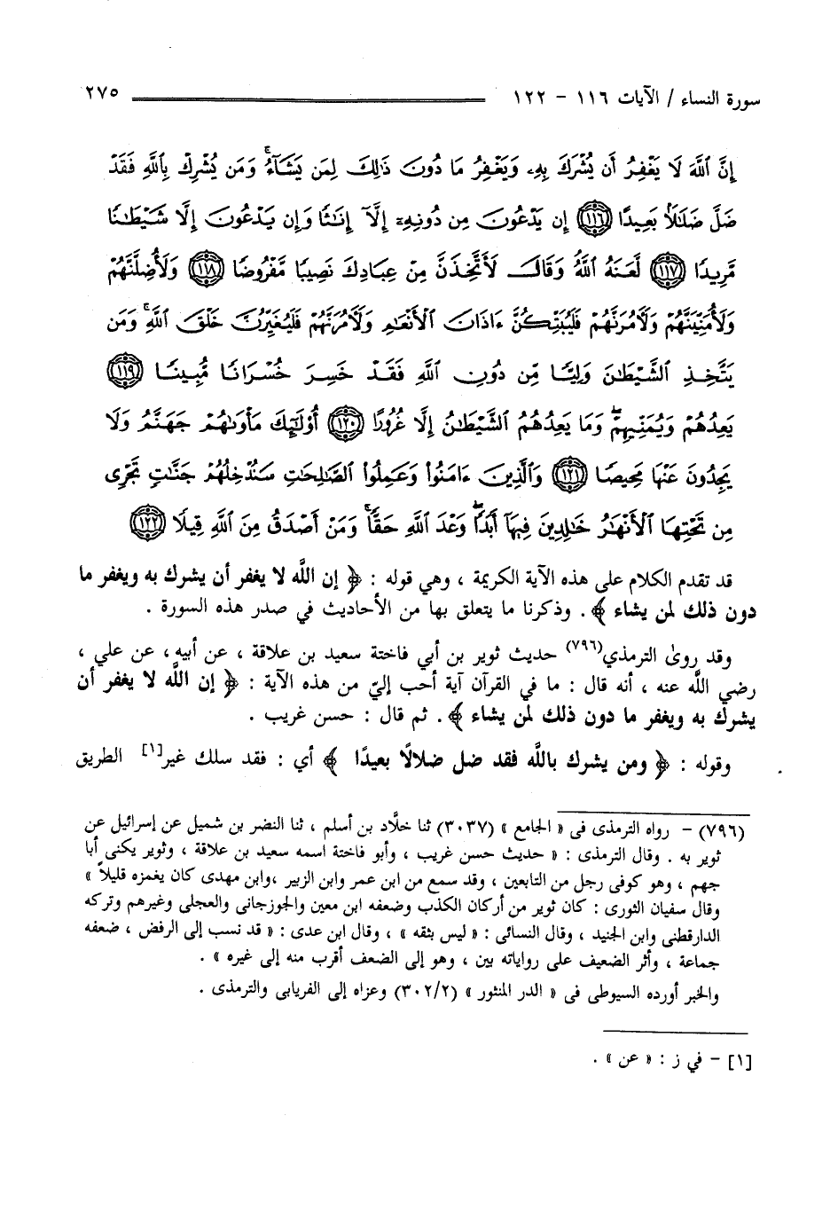 إِنَّ اللَّهَ لَا يَغْفِرُ أَنْ يُشْرَكَ بِهِ وَيَغْفِرُ مَا دُونَ ذَلِكَ لِمَنْ يَشَاءُ وَمَنْ يُشْرِكْ بِاللَّهِ فَقَدْ ضَلَّ ضَلَالًا بَعِيدًا (116)