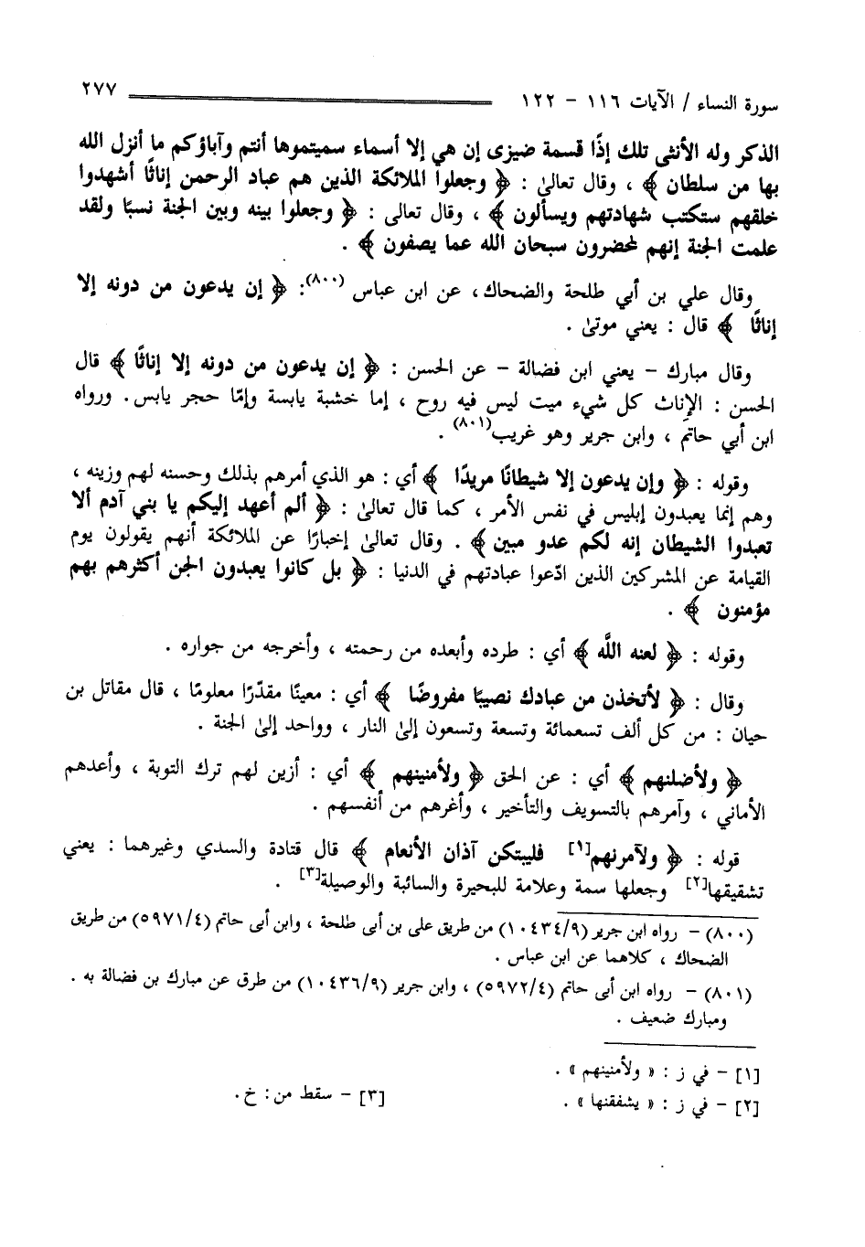 وَلَأُضِلَّنَّهُمْ وَلَأُمَنِّيَنَّهُمْ وَلَآَمُرَنَّهُمْ فَلَيُبَتِّكُنَّ آَذَانَ الْأَنْعَامِ وَلَآَمُرَنَّهُمْ فَلَيُغَيِّرُنَّ خَلْقَ اللَّهِ وَمَنْ يَتَّخِذِ الشَّيْطَانَ وَلِيًّا مِنْ دُونِ اللَّهِ فَقَدْ خَسِرَ خُسْرَانًا مُبِينًا (119)