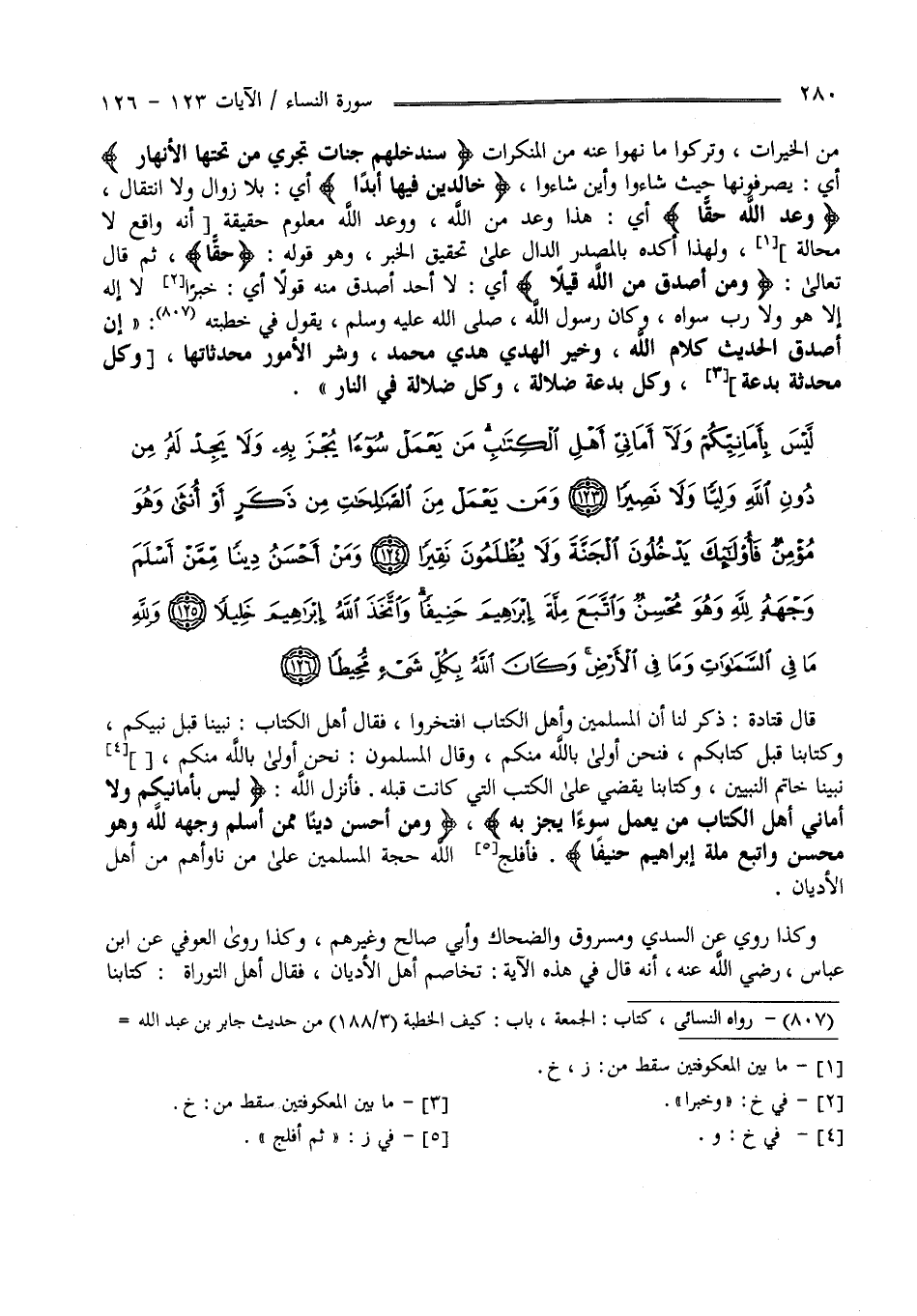 قَالَ قَتَادَة ذُكِرَ لَنَا أَنَّ الْمُسْلِمِينَ وَأَهْل الْكِتَاب اِفْتَخَرُوا فَقَالَ أَهْل الْكِتَاب : نَبِيّنَا قَبْل نَبِيّكُمْ وَكِتَابنَا قَبْل كِتَابكُمْ فَنَحْنُ أَوْلَى بِاَللَّهِ مِنْكُمْ وَقَالَ الْمُسْلِمُونَ : نَحْنُ أَوْلَى بِاَللَّهِ مِنْكُمْ وَنَبِيّنَا خَاتَم النَّبِيِّينَ وَكِتَابنَا يَقْضِي عَلَى الْكُتُب الَّتِي كَانَتْ قَبْله فَأَنْزَلَ اللَّه " لَيْسَ بِأَمَانِيِّكُمْ وَلَا أَمَانِيّ أَهْل الْكِتَاب مَنْ يَعْمَل سُوءًا يُجْزَ بِهِ " " وَمَنْ أَحْسَن دِينًا مِمَّنْ أَسْلَمَ وَجْهه لِلَّهِ وَهُوَ مُحْسِن " الْآيَة .