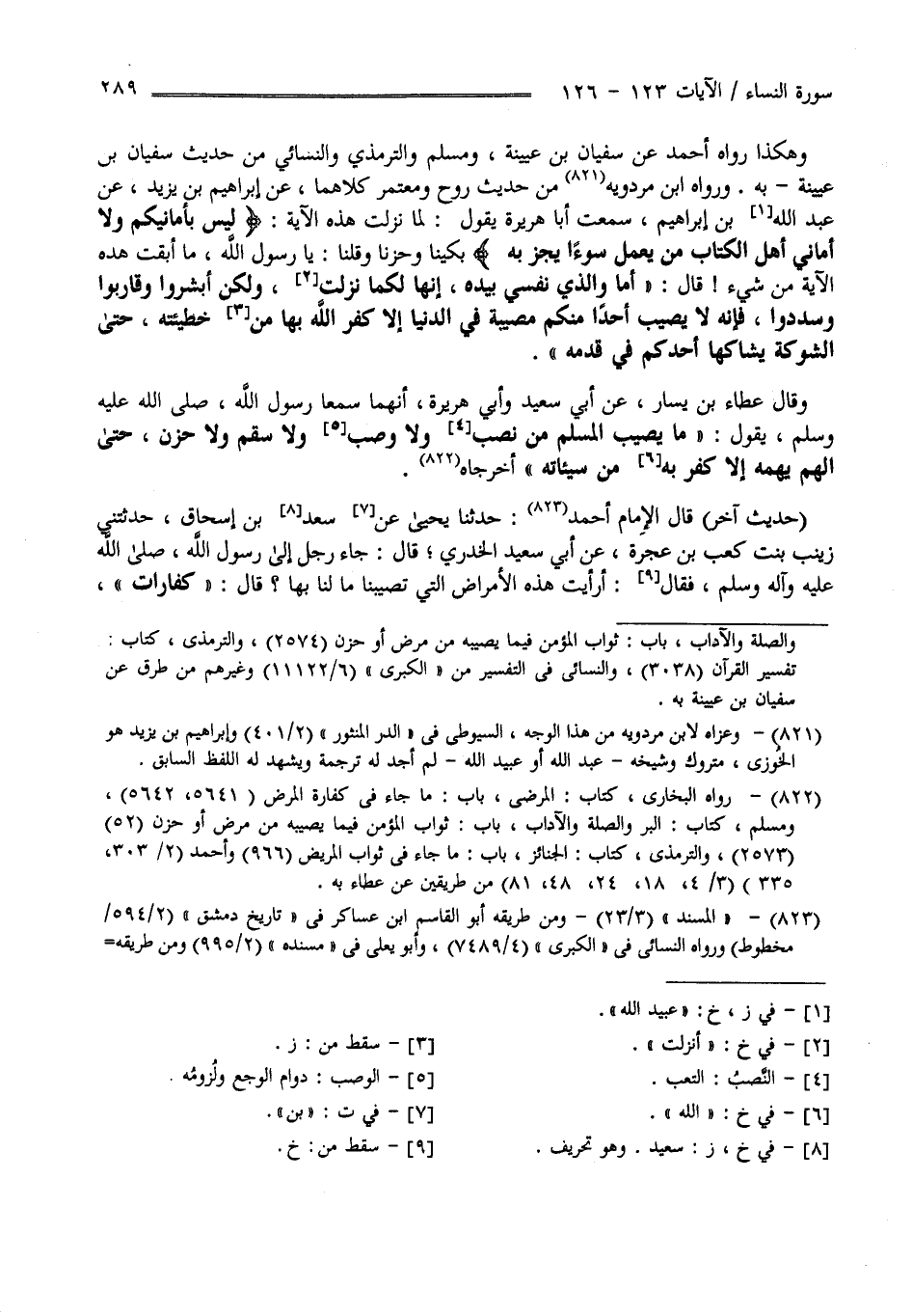 هَكَذَا رَوَاهُ أَحْمَد عَنْ سُفْيَان بْن عُيَيْنَة وَمُسْلِم وَالتِّرْمِذِيّ وَالنَّسَائِيّ مِنْ حَدِيث سُفْيَان بْن عُيَيْنَة بِهِ وَرَوَاهُ اِبْن جَرِير مِنْ حَدِيث رَوْح وَمَعْمَر كِلَاهُمَا عَنْ إِبْرَاهِيم بْن يَزِيد عَنْ عَبْد اللَّه بْن إِبْرَاهِيم سَمِعْت أَبَا هُرَيْرَة يَقُول : لَمَّا نَزَلَتْ هَذِهِ الْآيَة " لَيْسَ بِأَمَانِيِّكُمْ وَلَا أَمَانِيّ أَهْل الْكِتَاب مَنْ يَعْمَل سُوءًا يُجْزَ بِهِ " بَكَيْنَا وَحَزِنَّا وَقُلْنَا : يَا رَسُول اللَّه مَا أَبْقَتْ هَذِهِ الْآيَة مِنْ شَيْء قَالَ " أَمَا وَاَلَّذِي نَفْسِي بِيَدِهِ إِنَّهَا لَكَمَا أُنْزِلَتْ وَلَكِنْ أَبْشِرُوا وَقَارِبُوا وَسَدِّدُوا فَإِنَّهُ لَا يُصِيب أَحَدًا مِنْكُمْ مُصِيبَة فِي الدُّنْيَا إِلَّا كَفَّرَ اللَّه بِهَا مِنْ خَطِيئَته حَتَّى الشَّوْكَة يُشَاكهَا أَحَدكُمْ فِي قَدَمه " وَقَالَ عَطَاء بْن يَسَار عَنْ أَبِي سَعِيد وَأَبِي هُرَيْرَة إِنَّهُمَا سَمِعَا رَسُول اللَّه صَلَّى اللَّه عَلَيْهِ وَسَلَّمَ يَقُول " مَا يُصِيب الْمُسْلِم مِنْ نَصَب وَلَا وَصَب وَلَا سَقَم وَلَا حَزَن حَتَّى الْهَمّ يُهِمّهُ إِلَّا كَفَّرَ اللَّه مِنْ سَيِّئَاته " أَخْرَجَاهُ .