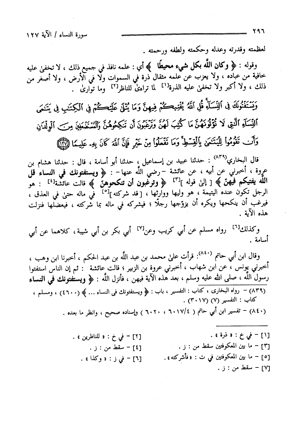 وَيَسْتَفْتُونَكَ فِي النِّسَاءِ قُلِ اللَّهُ يُفْتِيكُمْ فِيهِنَّ وَمَا يُتْلَى عَلَيْكُمْ فِي الْكِتَابِ فِي يَتَامَى النِّسَاءِ اللَّاتِي لَا تُؤْتُونَهُنَّ مَا كُتِبَ لَهُنَّ وَتَرْغَبُونَ أَنْ تَنْكِحُوهُنَّ وَالْمُسْتَضْعَفِينَ مِنَ الْوِلْدَانِ وَأَنْ تَقُومُوا لِلْيَتَامَى بِالْقِسْطِ وَمَا تَفْعَلُوا مِنْ خَيْرٍ فَإِنَّ اللَّهَ كَانَ بِهِ عَلِيمًا (127)
