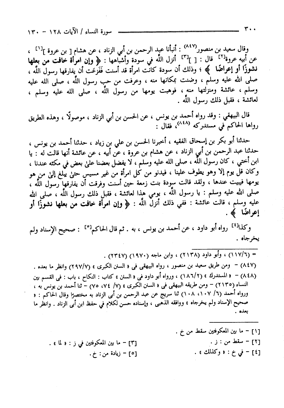 وَقَالَ سَعِيد بْن مَنْصُور أَنْبَأَنَا عَبْد الرَّحْمَن بْن أَبِي الزِّنَاد عَنْ هِشَام عَنْ أَبِيهِ عُرْوَة قَالَ : لَمَّا أَنْزَلَ اللَّه فِي سَوْدَة وَأَشْبَاههَا وَإِنْ اِمْرَأَة خَافَتْ مِنْ بَعْلهَا نُشُوزًا أَوْ إِعْرَاضًا وَذَلِكَ أَنَّ سَوْدَة كَانَتْ اِمْرَأَة قَدْ أَسَنَّتْ فَفَرَقَتْ أَنْ يُفَارِقهَا رَسُول اللَّه صَلَّى اللَّه عَلَيْهِ وَسَلَّمَ وَضَنَّتْ بِمَكَانِهَا مِنْهُ وَعَرَفَتْ مِنْ حُبّ رَسُول اللَّه صَلَّى اللَّه عَلَيْهِ وَسَلَّمَ عَائِشَة وَمَنْزِلَتهَا مِنْهُ فَوَهَبَتْ يَوْمهَا مِنْ رَسُول اللَّه صَلَّى اللَّه عَلَيْهِ وَسَلَّمَ لِعَائِشَة فَقَبِلَ ذَلِكَ رَسُول اللَّه صَلَّى اللَّه عَلَيْهِ وَسَلَّمَ قَالَ الْبَيْهَقِيّ وَقَدْ رَوَاهُ أَحْمَد بْن يُونُس عَنْ الْحَسَن بْن أَبِي الزِّنَاد مَوْصُولًا وَهَذِهِ الطَّرِيقَة رَوَاهَا الْحَاكِم فِي مُسْتَدْرَكه فَقَالَ : حَدَّثَنَا أَبُو بَكْر بْن إِسْحَاق الْفَقِيه أَخْبَرَنَا الْحَسَن بْن عَلِيّ بْن زِيَاد حَدَّثَنَا أَحْمَد بْن يُونُس حَدَّثَنَا عَبْد الرَّحْمَن بْن أَبِي الزِّنَاد عَنْ هِشَام بْن عُرْوَة عَنْ أَبِيهِ عَنْ عَائِشَة أَنَّهَا قَالَتْ لَهُ : يَا اِبْن أَخِي : كَانَ رَسُول اللَّه صَلَّى اللَّه عَلَيْهِ وَسَلَّمَ لَا يُفَضِّل بَعْضنَا عَلَى بَعْض فِي مُكْثه عِنْدنَا وَكَانَ قَلَّ يَوْم إِلَّا وَهُوَ يَطُوف عَلَيْنَا وَيَدْنُو مِنْ كُلّ اِمْرَأَة مِنْ غَيْر مَسِيس حَتَّى يَبْلُغ إِلَى مَنْ هُوَ يَوْمهَا فَيَبِيت عِنْدهَا وَلَقَدْ قَالَتْ سَوْدَة بِنْت زَمْعَة حِين أَسَنَّتْ وَفَرَقَتْ أَنْ يُفَارِقهَا رَسُول اللَّه صَلَّى اللَّه عَلَيْهِ وَسَلَّمَ يَا رَسُول اللَّه يَوْمِي هَذَا لِعَائِشَة فَقَبِلَ ذَلِكَ رَسُول اللَّه صَلَّى اللَّه عَلَيْهِ وَسَلَّمَ قَالَتْ عَائِشَة فَفِي ذَلِكَ أَنْزَلَ اللَّه وَإِنْ اِمْرَأَة خَافَتْ مِنْ بَعْلهَا نُشُوزًا أَوْ إِعْرَاضًا وَكَذَلِكَ رَوَاهُ أَبُو دَاوُد عَنْ أَحْمَد بْن يُونُس بِهِ وَالْحَاكِم فِي مُسْتَدْرَكه ثُمَّ قَالَ صَحِيح الْإِسْنَاد وَلَمْ يُخَرِّجَاهُ .
