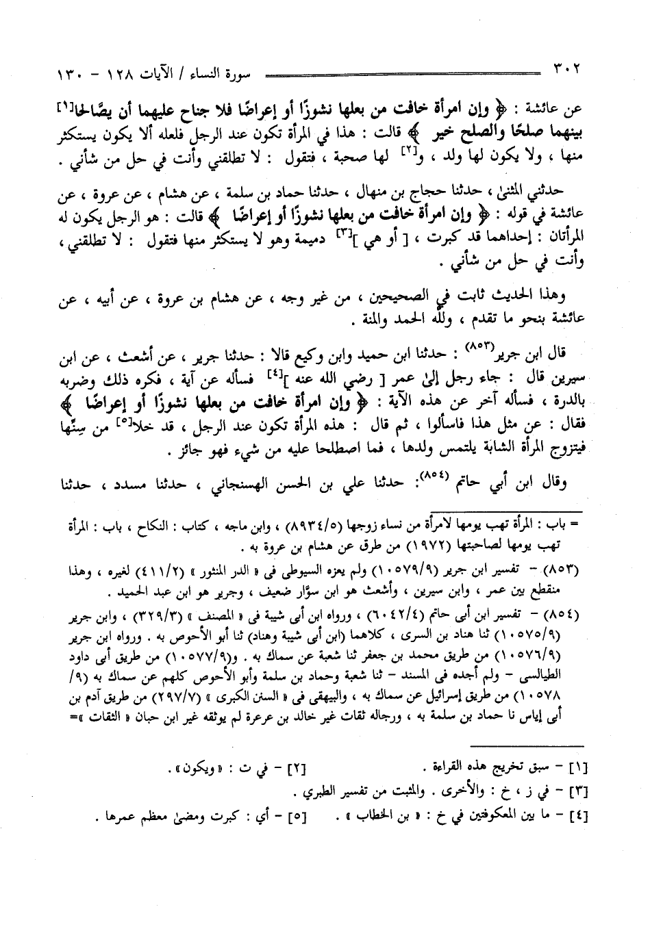 حَدَّثَنِي الْمُثَنَّى حَدَّثَنَا حَجَّاج بْن مِنْهَال حَدَّثَنَا حَمَّاد بْن سَلَمَة عَنْ هِشَام عَنْ عُرْوَة عَنْ عَائِشَة فِي قَوْله وَإِنْ اِمْرَأَة خَافَتْ مِنْ بَعْلهَا نُشُوزًا أَوْ إِعْرَاضًا قَالَتْ : هُوَ الرَّجُل يَكُون لَهُ الْمَرْأَتَانِ إِحْدَاهُمَا قَدْ كَبِرَتْ وَالْأُخْرَى دَمِيمَة وَهُوَ لَا يَسْتَكْثِر مِنْهَا فَتَقُول : لَا تُطَلِّقنِي وَأَنْتَ فِي حِلّ مِنْ شَأْنِي وَهَذَا الْحَدِيث ثَابِت فِي الصَّحِيحَيْنِ مِنْ غَيْر وَجْه عَنْ هِشَام بْن عُرْوَة عَنْ أَبِيهِ عَنْ عَائِشَة بِنَحْوِ مَا تَقَدَّمَ وَلِلَّهِ الْحَمْد وَالْمِنَّة.