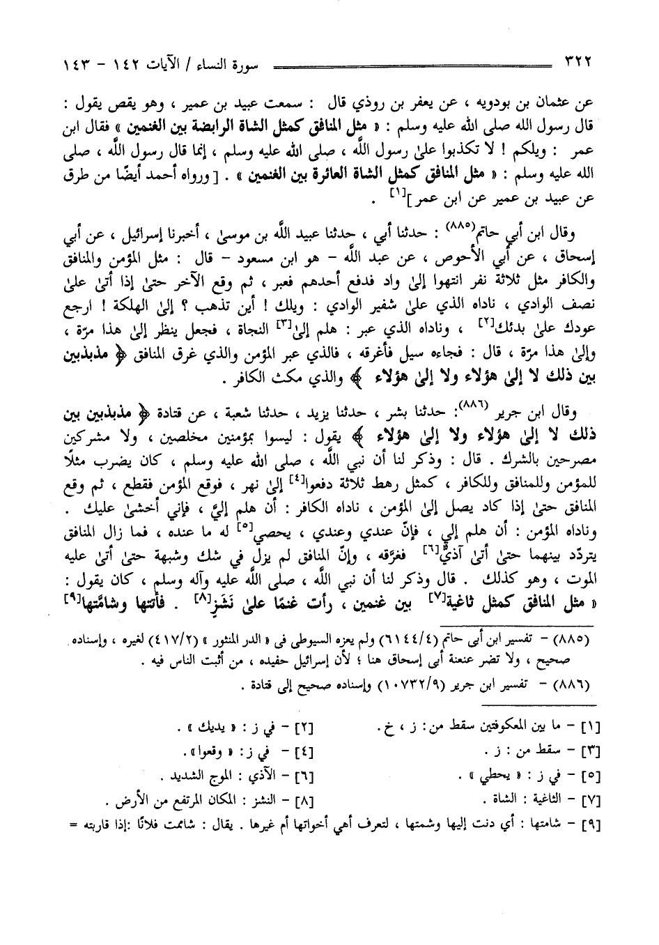 عَنْ عُثْمَان بْن يَزْدَوَيْهِ عَنْ يَعْفُر بْن رُوذِيّ قَالَ : سَمِعْت عُبَيْد بْن عُمَيْر وَهُوَ يَقُصّ يَقُول قَالَ رَسُول اللَّه صَلَّى اللَّه عَلَيْهِ وَسَلَّمَ " مَثَل الْمُنَافِق كَمَثَلِ الشَّاة الرَّابِضَة بَيْن الْغَنَمَيْنِ " فَقَالَ اِبْن عُمَر : وَيْلكُمْ لَا تَكْذِبُوا عَلَى رَسُول اللَّه صَلَّى اللَّه عَلَيْهِ وَسَلَّمَ إِنَّمَا قَالَ رَسُول اللَّه صَلَّى اللَّه عَلَيْهِ وَسَلَّمَ اللَّه عَلَيْهِ وَسَلَّمَ " مَثَل الْمُنَافِق كَمَثَلِ الشَّاة الْعَائِرَة بَيْن الْغَنَمَيْنِ " وَرَوَاهُ أَحْمَد أَيْضًا مِنْ طُرُق عَنْ عُبَيْد بْن عُمَيْر عَنْ اِبْن عُمَر وَرَوَاهُ اِبْن أَبِي حَاتِم حَدَّثَنَا أَبِي حَدَّثَنَا عُبَيْد بْن مُوسَى أَخْبَرَنَا إِسْرَائِيل عَنْ أَبِي إِسْحَاق عَنْ أَبِي الْأَحْوَص عَنْ عَبْد اللَّه هُوَ اِبْن مَسْعُود قَالَ : مَثَل الْمُؤْمِن وَالْمُنَافِق وَالْكَافِر مِثْل ثَلَاثَة نَفَر اِنْتَهَوْا إِلَى وَادٍ فَوَقَعَ أَحَدهمْ فَعَبَرَ ثُمَّ وَقَعَ الْآخَر حَتَّى إِذَا أَتَى عَلَى نِصْف الْوَادِي نَادَاهُ الَّذِي عَلَى شَفِير الْوَادِي وَيْلك أَيْنَ تَذْهَب إِلَى الْهَلَكَة اِرْجِعْ عَوْدك عَلَى بَدْئِك وَنَادَاهُ الَّذِي عَبَرَ هَلُمَّ إِلَى النَّجَاة فَجَعَلَ يَنْظُر إِلَى هَذَا مَرَّة وَإِلَى هَذَا مَرَّة قَالَ فَجَاءَهُ سَيْل فَأَغْرَقَهُ فَاَلَّذِي عَبَرَ هُوَ الْمُؤْمِن وَاَلَّذِي غَرِقَ الْمُنَافِق مُذَبْذَبِينَ بَيْن ذَلِكَ لَا إِلَى هَؤُلَاءِ وَلَا إِلَى هَؤُلَاءِ وَاَلَّذِي مَكَثَ الْكَافِر .