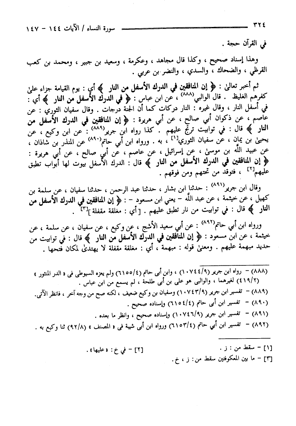 قَالَ الْوَالِبِيّ عَنْ اِبْن عَبَّاس فِي الدَّرْك الْأَسْفَل مِنْ النَّار أَيْ فِي أَسْفَل النَّار وَقَالَ غَيْره : النَّار دَرَجَات كَمَا أَنَّ الْجَنَّة دَرَجَات " وَقَالَ سُفْيَان الثَّوْرِيّ عَنْ عَاصِم عَنْ ذَكْوَان أَبِي صَالِح عَنْ أَبِي هُرَيْرَة " إِنَّ الْمُنَافِقِينَ فِي الدَّرْك الْأَسْفَل مِنْ النَّار " قَالَ فِي تَوَابِيت تُرْتَج عَلَيْهِمْ .