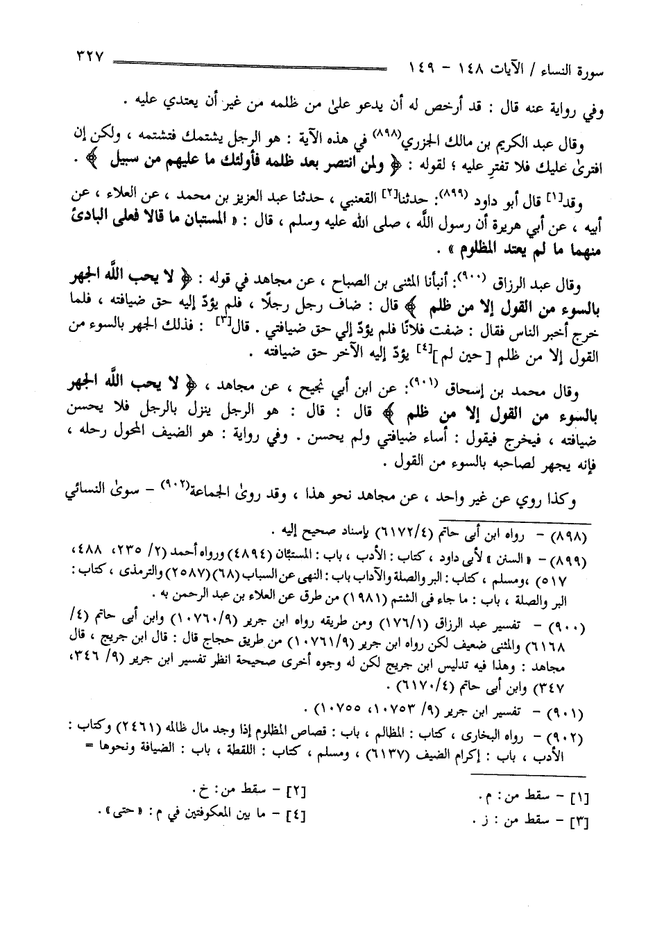وَفِي رِوَايَة عَنْهُ قَالَ : قَدْ رَخَّصَ لَهُ أَنْ يَدْعُو عَلَى مَنْ ظَلَمَهُ مِنْ غَيْر أَنْ يَعْتَدِي عَلَيْهِ وَقَالَ عَبْد الْكَرِيم بْن مَالِك الْجَزَرِيّ فِي هَذِهِ الْآيَة هُوَ الرَّجُل يَشْتُمك فَتَشْتُمهُ وَلَكِنْ إِنْ اِفْتَرَى عَلَيْك فَلَا تَفْتَرِ عَلَيْهِ لِقَوْلِهِ " وَلَمَنْ اِنْتَصَرَ بَعْد ظُلْمه فَأُولَئِكَ مَا عَلَيْهِمْ مِنْ سَبِيل " وَقَالَ أَبُو دَاوُد : حَدَّثَنَا الْقَعْنَبِيّ حَدَّثَنَا عَبْد الْعَزِيز بْن مُحَمَّد عَنْ الْعَلَاء عَنْ أَبِيهِ عَنْ أَبِي هُرَيْرَة أَنَّ رَسُول اللَّه صَلَّى اللَّه عَلَيْهِ وَسَلَّمَ قَالَ " الْمُسْتَبَّانِ مَا قَالَا فَعَلَى الْبَادِئ مِنْهُمَا مَا لَمْ يَعْتَدِ الْمَظْلُوم " وَقَالَ عَبْد الرَّزَّاق أَنْبَأَنَا الْمُثَنَّى بْن الصَّبَّاح عَنْ مُجَاهِد فِي قَوْله " لَا يُحِبّ اللَّه الْجَهْر بِالسُّوءِ مِنْ الْقَوْل " إِلَّا مَنْ ظُلِمَ قَالَ ضَافَ رَجُل رَجُلًا فَلَمْ يُؤَدِّ إِلَيْهِ حَقّ ضِيَافَته فَلَمَّا خَرَجَ أَخَّرَ النَّاس فَقَالَ : ضِفْت فُلَانًا فَلَمْ يُؤَدِّ إِلَيَّ حَقّ ضِيَافَتِي قَالَ فَذَلِكَ الْجَهْر بِالسُّوءِ مِنْ الْقَوْل إِلَّا مَنْ ظُلِمَ حَتَّى يُؤَدِّي الْآخَر إِلَيْهِ حَقّ ضِيَافَته وَقَالَ اِبْن إِسْحَاق عَنْ اِبْن أَبِي نَجِيح عَنْ مُجَاهِد لَا يُحِبّ اللَّه الْجَهْر بِالسُّوءِ مِنْ الْقَوْل إِلَّا مَنْ ظُلِمَ قَالَ : قَالَ هُوَ الرَّجُل يَنْزِل بِالرَّجُلِ فَلَا يُحْسِن ضِيَافَته فَيَخْرُج فَيَقُول أَسَاءَ ضِيَافَتِي وَلَمْ يُحْسِن .