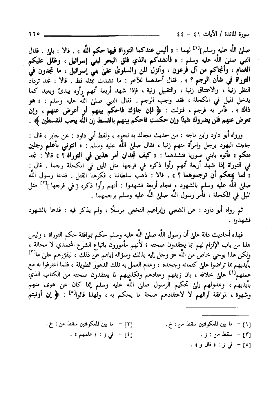 التَّوْرَاة فِيهَا حُكْم اللَّه قَالَا بَلَى قَالَ النَّبِيّ صَلَّى اللَّه عَلَيْهِ وَسَلَّمَ أَنْشُدكُمْ بِاَلَّذِي فَلَقَ الْبَحْر لِبَنِي إِسْرَائِيل وَظَلَّلَ عَلَيْكُمْ الْغَمَام وَأَنْجَاكُمْ مِنْ آلِ فِرْعَوْن وَأَنْزَلَ الْمَنّ وَالسَّلْوَى عَلَى بَنِي إِسْرَائِيل مَا تَجِدُونَ فِي التَّوْرَاة فِي شَأْن الرَّجْم فَقَالَ أَحَدهمَا لِلْآخَرِ مَا نُشِدْت بِمِثْلِهِ قَطُّ ثُمَّ قَالَا نَجِد تَرْدَاد النَّظَر زَنْيَة وَالِاعْتِنَاق زَنْيَة وَالتَّقْبِيل زَنْيَة فَإِذَا شَهِدَ أَرْبَعَة أَنَّهُمْ رَأَوْهُ يُبْدِئ وَيُعِيد كَمَا يَدْخُل الْمِيل فِي الْمُكْحُلَة فَقَدْ وَجَبَ الرَّجْم فَقَالَ النَّبِيّ هُوَ ذَاكَ فَأَمَرَ بِهِ فَرُجِمَ فَنَزَلَتْ فَإِنْ جَاءُوك فَاحْكُمْ بَيْنهمْ أَوْ أَعْرِضْ عَنْهُمْ وَإِنْ تُعْرِضْ عَنْهُمْ فَلَنْ يَضُرُّوك شَيْئًا وَإِنْ حَكَمْت فَاحْكُمْ بَيْنهمْ بِالْقِسْطِ إِنَّ اللَّه يُحِبّ الْمُقْسِطِينَ وَرَوَاهُ أَبُو دَاوُدَ وَابْن مَاجَهْ مِنْ حَدِيث مُجَالِد بِهِ نَحْوه وَلَفْظ أَبِي دَاوُدَ عَنْ جَابِر قَالَ جَاءَتْ الْيَهُود بِرَجُلٍ وَامْرَأَة مِنْهُمْ زَنَيَا فَقَالَ اِئْتُونِي بِأَعْلَمِ رَجُلَيْنِ مِنْكُمْ فَأَتَوْا بِابْنَيْ صُورِيَّا فَنَشَدَهُمَا كَيْف تَجِدَانِ أَمْر هَذَيْنِ فِي التَّوْرَاة ؟ قَالَا نَجِدُ إِذَا شَهِدَ أَرْبَعَةٌ أَنَّهُمْ رَأَوْا ذَكَرَهُ فِي فَرْجِهَا مِثْل الْمِيل فِي الْمُكْحُلَة رُجِمَا قَالَ فَمَا يَمْنَعُكُمْ أَنْ تَرْجُمُوهُمَا قَالَا ذَهَبَ سُلْطَانُنَا فَكَرِهْنَا الْقَتْلَ فَدَعَا رَسُول اللَّه صَلَّى اللَّه عَلَيْهِ وَسَلَّمَ بِالشُّهُودِ فَجَاءَ أَرْبَعَةٌ فَشَهِدُوا أَنَّهُمْ رَأَوْا ذَكَرَهُ مِثْل الْمِيلِ فِي الْمُكْحُلَةِ فَأَمَرَ رَسُول اللَّه صَلَّى اللَّه عَلَيْهِ وَسَلَّمَ بِرَجْمِهِمَا ثُمَّ رَوَاهُ أَبُو دَاوُدَ عَنْ الشَّعْبِيّ وَإِبْرَاهِيم النَّخَعِيّ مُرْسَلًا وَلَمْ يَذْكُر فِيهِ فَدَعَا بِالشُّهُودِ فَشَهِدُوا فَهَذِهِ الْأَحَادِيث دَالَّة عَلَى أَنَّ رَسُول اللَّه صَلَّى اللَّه عَلَيْهِ وَسَلَّمَ حَكَمَ بِمُوَافَقَةِ حُكْم التَّوْرَاة وَلَيْسَ هَذَا مِنْ بَاب الْإِكْرَام لَهُمْ بِمَا يَعْتَقِدُونَ صِحَّته لِأَنَّهُمْ مَأْمُورُونَ بِاتِّبَاعِ الشَّرْع الْمُحَمَّدِيّ لَا مَحَالَة وَلَكِنَّ هَذَا بِوَحْيٍ خَاصّ مِنْ اللَّه عَزَّ وَجَلَّ إِلَيْهِ بِذَلِكَ وَسُؤَاله إِيَّاهُمْ عَنْ ذَلِكَ لِيُقَرِّرهُمْ عَلَى مَا بِأَيْدِيهِمْ مِمَّا تَوَاطَئُوا عَلَى كِتْمَانه وَجَحْده وَعَدَم الْعَمَل بِهِ تِلْكَ الدُّهُور الطَّوِيلَة فَلَمَّا اِعْتَرَفُوا بِهِ مَعَ عِلْمهمْ عَلَى خِلَافه بِأَنَّ زَيْغهمْ وَعِنَادهمْ وَتَكْذِيبهمْ لِمَا يَعْتَقِدُونَ صِحَّته مِنْ الْكِتَاب الَّذِي بِأَيْدِيهِمْ وَعَدُوّ لَهُمْ إِلَى تَحْكِيم الرَّسُول صَلَّى اللَّه عَلَيْهِ وَسَلَّمَ إِنَّمَا كَانَ عَنْ هَوًى مِنْهُمْ وَشَهْوَة لِمُوَافَقَةِ آرَائِهِمْ لَا لِاعْتِقَادِهِمْ صِحَّة مَا يَحْكُم بِهِ وَلِهَذَا قَالُوا إِنْ أُوتِيتُمْ