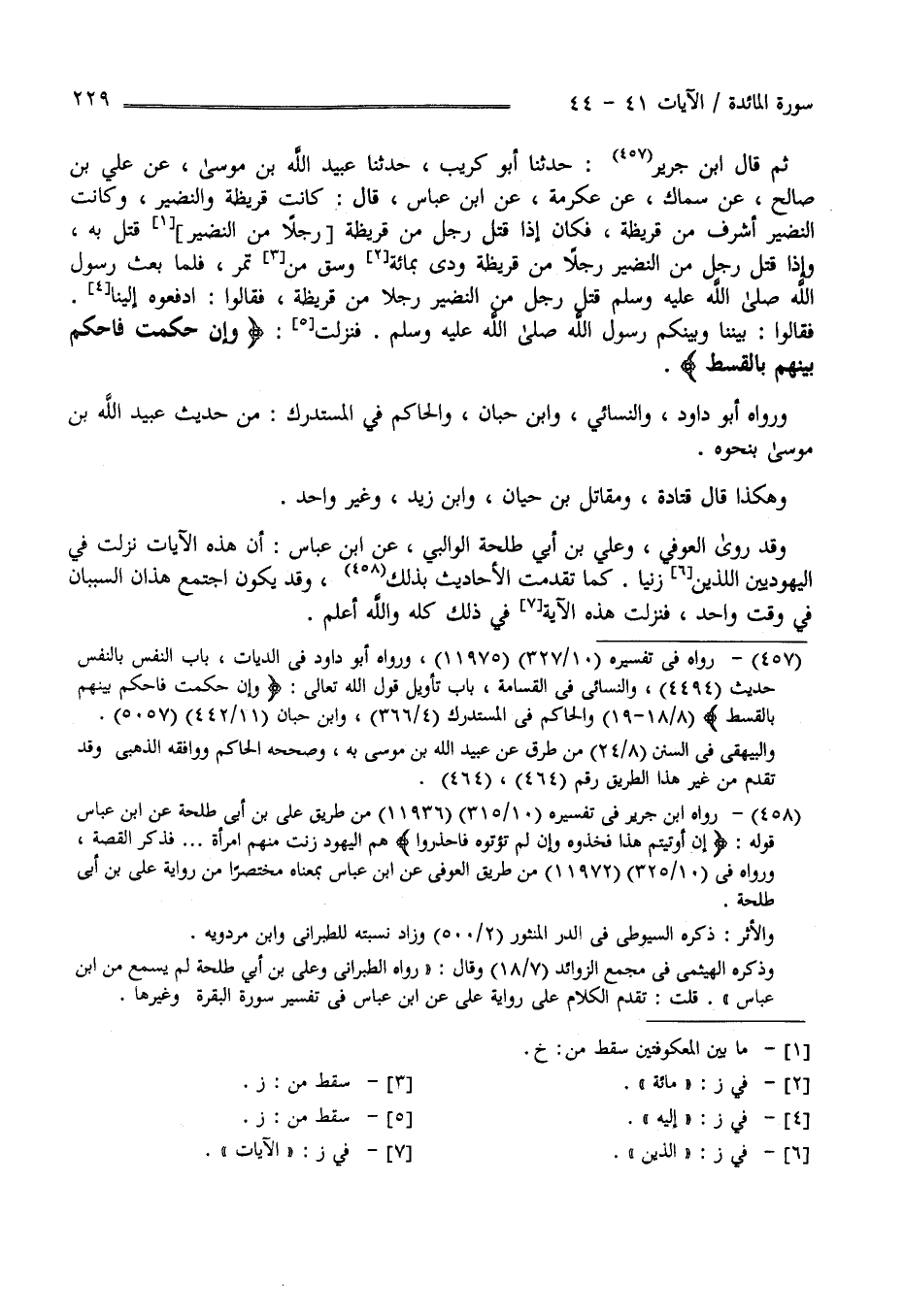 ثُمَّ قَالَ اِبْن جَرِير حَدَّثَنَا أَبُو كُرَيْب حَدَّثَنَا عُبَيْد اللَّه بْن مُوسَى عَنْ عَلِيّ بْن صَالِح عَنْ سِمَاك عَنْ عِكْرِمَة عَنْ اِبْن عَبَّاس قَالَ كَانَتْ قُرَيْظَة وَالنَّضِير وَكَانَتْ النَّضِير أَشْرَفَ مِنْ قُرَيْظَة فَكَانَ إِذَا قَتَلَ الْقُرَظِيّ رَجُلًا مِنْ النَّضِير قُتِلَ بِهِ وَإِنْ قَتَلَ النَّضَرِيّ رَجُلًا مِنْ قُرَيْظَة وُدِيَ بِمِائَةِ وَسْق مِنْ تَمْر فَلَمَّا بُعِثَ رَسُول اللَّه صَلَّى اللَّه عَلَيْهِ وَسَلَّمَ قَتَلَ رَجُلًا مِنْ النَّضِير رَجُلًا مِنْ قُرَيْظَة فَقَالُوا اِدْفَعُوهُ إِلَيْهِ فَقَالُوا بَيْننَا وَبَيْنكُمْ رَسُول اللَّه فَنَزَلَتْ وَإِنْ حَكَمْت فَاحْكُمْ بَيْنهمْ بِالْقِسْطِ وَرَوَاهُ أَبُو دَاوُدَ وَالنَّسَائِيّ وَابْن حِبَّان وَالْحَاكِم فِي الْمُسْتَدْرَك مِنْ حَدِيث عَبْد اللَّه بْن مُوسَى بِنَحْوِهِ وَهَكَذَا قَالَ قَتَادَة وَمُقَاتِل بْن حِبَّان وَابْن زَيْد وَغَيْرُ وَاحِد وَرَوَى الْعَوْفِيّ وَعَلِيّ بْن أَبِي طَلْحَة الْوَالِبِيّ عَنْ اِبْن عَبَّاس أَنَّ هَذِهِ الْآيَات نَزَلَتْ فِي الْيَهُودِيَّيْنِ اللَّذَيْنِ زَنَيَا كَمَا تَقَدَّمَتْ الْأَحَادِيث بِذَلِكَ وَقَدْ يَكُون اِجْتَمَعَ هَذَانِ السَّبَبَانِ فِي وَقْت وَاحِد فَنَزَلَتْ هَذِهِ الْآيَات فِي ذَلِكَ كُلّه وَاَللَّه أَعْلَمُ