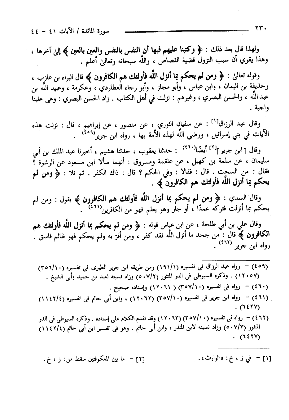 وَلِهَذَا قَالَ بَعْد ذَلِكَ وَكَتَبْنَا عَلَيْهِمْ فِيهَا أَنَّ النَّفْس بِالنَّفْسِ وَالْعَيْن بِالْعَيْنِ إِلَى آخِرهَا وَهَذَا يَقُول أَنَّ سَبَب النُّزُول قَضِيَّة الْقِصَاص وَاَللَّه سُبْحَانه وَتَعَالَى أَعْلَم وَقَوْله تَعَالَى وَمَنْ لَمْ يَحْكُم بِمَا أَنْزَلَ اللَّه فَأُولَئِكَ هُمْ الْكَافِرُونَ قَالَ الْبَرَاء بْن عَازِب وَحُذَيْفَة بْن الْيَمَان وَابْن عَبَّاس وَأَبُو مِجْلَز وَأَبُو رَجَاء الْعُطَارِدِيّ وَعِكْرِمَة وَعُبَيْد اللَّه بْن عَبْد اللَّه وَالْحَسَن الْبَصْرِيّ وَغَيْرهمْ : نَزَلَتْ فِي أَهْل الْكِتَاب زَادَ الْحَسَن الْبَصْرِيّ وَهِيَ عَلَيْنَا وَاجِبَة وَقَالَ عَبْد الرَّزَّاق عَنْ سُفْيَان الثَّوْرِيّ عَنْ مَنْصُور عَنْ إِبْرَاهِيم قَالَ نَزَلَتْ هَذِهِ الْآيَات فِي بَنِي إِسْرَائِيل وَرَضِيَ اللَّه لِهَذِهِ الْأُمَّة بِهَا رَوَاهُ اِبْن جَرِير وَقَالَ اِبْن جَرِير أَيْضًا حَدَّثَنَا