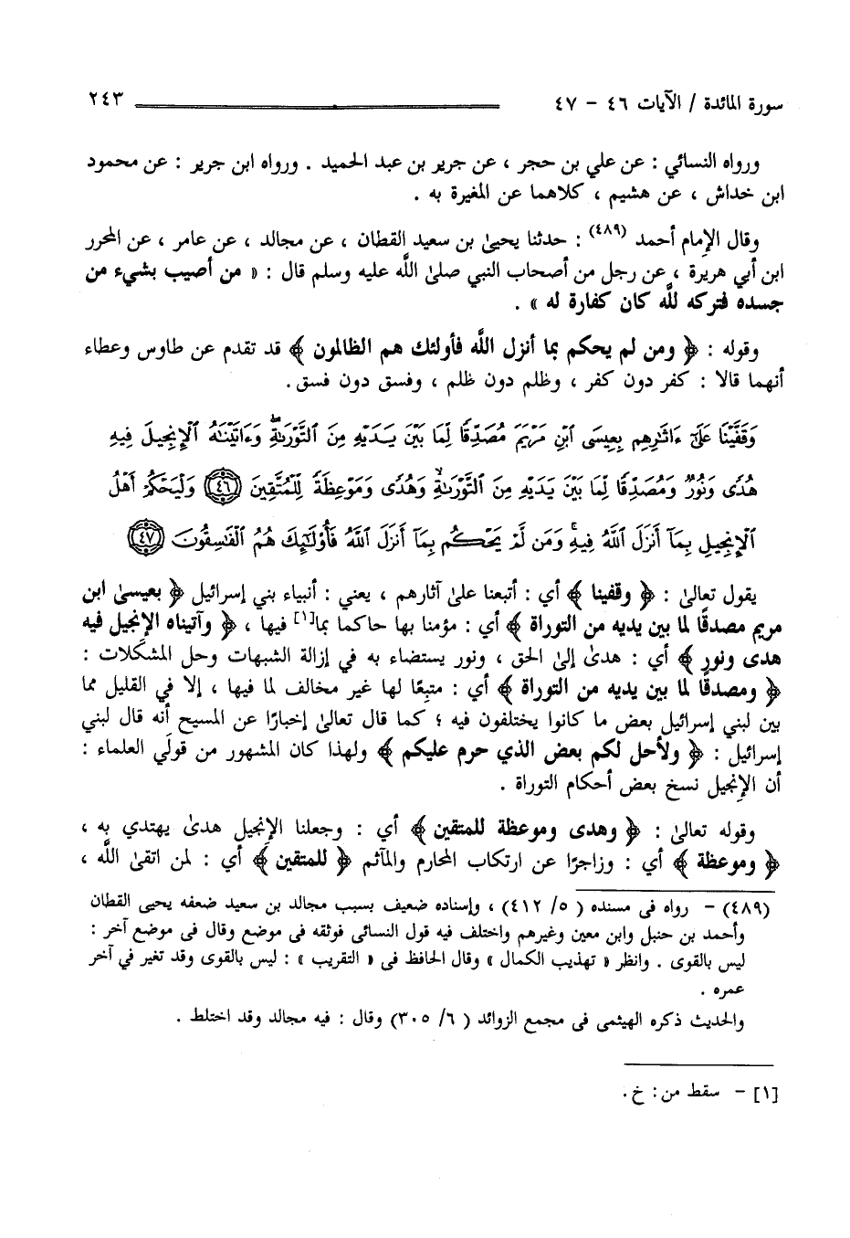 يَقُول تَعَالَى " وَقَفَّيْنَا " أَيْ أَتْبَعْنَا عَلَى آثَارهمْ يَعْنِي أَنْبِيَاء بَنِي إِسْرَائِيل " بِعِيسَى اِبْن مَرْيَم مُصَدِّقًا لِمَا بَيْن يَدَيْهِ مِنْ التَّوْرَاة" أَيْ مُؤْمِنًا بِهَا حَاكِمًا بِمَا فِيهَا " وَآتَيْنَاهُ الْإِنْجِيل فِيهِ هُدًى وَنُور " أَيْ هُدًى إِلَى الْحَقّ وَنُور يُسْتَضَاء بِهِ فِي إِزَالَة الشُّبُهَات وَحَلّ الْمُشْكِلَات وَمُصَدِّقًا لِمَا بَيْن يَدَيْهِ مِنْ التَّوْرَاة أَيْ مُتَّبِعًا لَهَا غَيْر مُخَالِف لِمَا فِيهَا إِلَّا فِي الْقَلِيل مِمَّا بَيَّنَ لِبَنِي إِسْرَائِيل بَعْض مَا كَانُوا يَخْتَلِفُونَ فِيهِ كَمَا قَالَ تَعَالَى إِخْبَارًا عَنْ الْمَسِيح أَنَّهُ قَالَ : لِبَنِي إِسْرَائِيل " وَلِأُحِلّ لَكُمْ بَعْض الَّذِي حَرَّمَ عَلَيْكُمْ " وَلِهَذَا كَانَ الْمَشْهُور مِنْ قَوْل الْعُلَمَاء أَنَّ الْإِنْجِيل نَسَخَ بَعْض أَحْكَام التَّوْرَاة وَقَوْله تَعَالَى " وَهُدًى وَمَوْعِظَة لِلْمُتَّقِينَ " أَيْ وَجَعَلْنَا الْإِنْجِيل هُدًى يُهْدَى بِهِ وَمَوْعِظَة أَيْ زَاجِرًا عَنْ اِرْتِكَاب الْمَحَارِم وَالْمَآثِم لِلْمُتَّقِينَ أَيْ لِمَنْ اِتَّقَى اللَّه