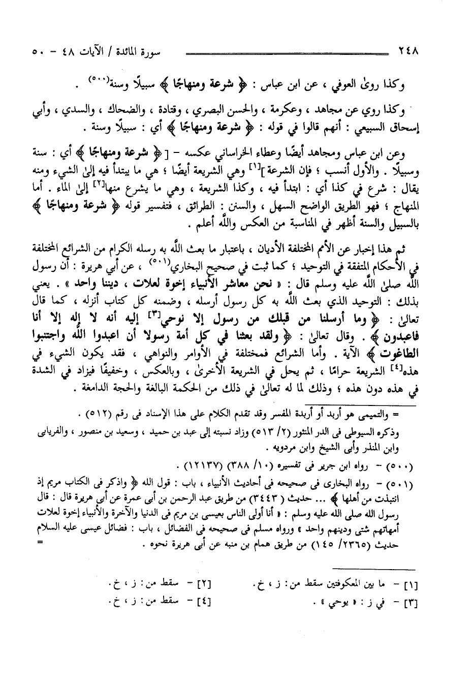 وَعَنْ اِبْن عَبَّاس أَيْضًا وَمُجَاهِد أَيْ وَعَطَاء الْخُرَاسَانِيّ عَكْسه " شِرْعَة وَمِنْهَاجًا " أَيْ سُنَّة وَسَبِيلًا وَالْأَوَّلُ أَنْسَبُ فَإِنَّ الشِّرْعَة وَهِيَ الشَّرِيعَة أَيْضًا هِيَ مَا يُبْتَدَأ فِيهِ إِلَى الشَّيْء وَمِنْهُ يُقَال شَرَعَ فِي كَذَا أَيْ اِبْتَدَأَ فِيهِ وَكَذَا الشَّرِيعَة وَهِيَ مَا يُشْرَع فِيهَا إِلَى الْمَاء أَمَّا الْمِنْهَاج فَهُوَ الطَّرِيق الْوَاضِح السَّهْل وَالسُّنَن الطَّرَائِق فَتَفْسِير قَوْله " شِرْعَة وَمُهَاجًا" بِالسَّبِيلِ وَالسُّنَّة أَظْهَرُ فِي الْمُنَاسَبَة مِنْ الْعَكْس وَاَللَّه أَعْلَمُ ثُمَّ هُوَ الْإِخْبَار عَنْ الْأُمَم الْمُخْتَلِفَة الْأَدْيَان بِاعْتِبَارِ مَا بَعَثَ اللَّه بِهِ رُسُله الْكِرَام مِنْ الشَّرَائِع الْمُخْتَلِفَة فِي الْأَحْكَام الْمُتَّفِقَة فِي التَّوْحِيد كَمَا ثَبَتَ فِي صَحِيح الْبُخَارِيّ عَنْ أَبِي هُرَيْرَة أَنَّ رَسُول اللَّه - صَلَّى اللَّه عَلَيْهِ وَسَلَّمَ - قَالَ : " نَحْنُ مَعَاشِر الْأَنْبِيَاء إِخْوَة لِعَلَّاتٍ دِيننَا وَاحِدٌ " يَعْنِي بِذَلِكَ التَّوْحِيد الَّذِي بَعَثَ اللَّه بِهِ كُلّ رَسُول أَرْسَلَهُ وَضَمَّنَهُ كُلّ كِتَاب أَنْزَلَهُ كَمَا قَالَ تَعَالَى وَمَا أَرْسَلْنَا مِنْ قَبْلك مِنْ رَسُول إِلَّا نُوحِي إِلَيْهِ أَنْ لَا إِلَه إِلَّا أَنَا فَاعْبُدُونِ وَقَالَ تَعَالَى وَلَقَدْ بَعَثْنَا فِي كُلّ أُمَّة رَسُولًا أَنْ اُعْبُدُوا اللَّه وَاجْتَنِبُوا الطَّاغُوت الْآيَة وَأَمَّا الشَّرَائِع فَمُخْتَلِفَة فِي الْأَوَامِر وَالنَّوَاهِي فَقَدْ يَكُون الشَّيْء فِي هَذِهِ الشَّرِيعَة حَرَامًا ثُمَّ يَحِلّ فِي الشَّرِيعَة الْأُخْرَى وَبِالْعَكْسِ وَخَفِيفًا فَيُزَاد فِي الشِّدَّة فِي هَذِهِ دُون هَذِهِ وَذَلِكَ لِمَا لَهُ تَعَالَى فِي ذَلِكَ مِنْ الْحِكْمَة الْبَالِغَة وَالْحُجَّة الدَّامِغَة