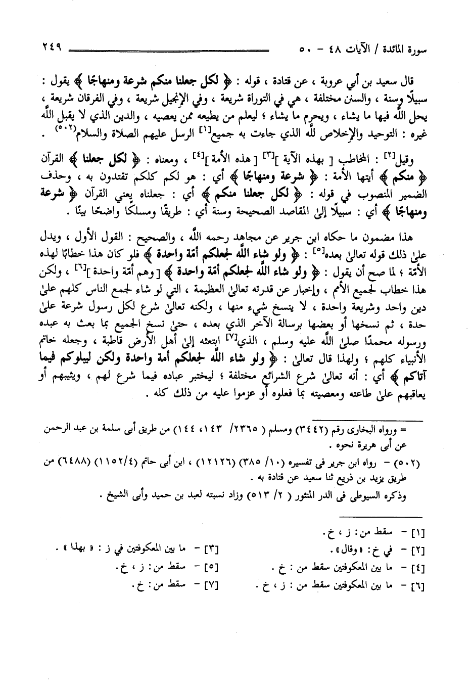 قَالَ سَعِيد بْن أَبِي عَرُوبَة عَنْ قَتَادَة قَوْله لِكُلٍّ جَعَلْنَا مِنْكُمْ شِرْعَة وَمِنْهَاجًا يَقُول سَبِيلًا وَسُنَنًا وَالسُّنَن مُخْتَلِفَة هِيَ فِي التَّوْرَاة شَرِيعَة وَفِي الْإِنْجِيل شَرِيعَة وَفِي الْفُرْقَان شَرِيعَة يُحِلّ اللَّه فِيهَا مَا يَشَاء وَيُحَرِّم مَا يَشَاء لِيَعْلَم مَنْ يُطِيعهُ مِمَّنْ يَعْصِيه وَالدِّين الَّذِي لَا يَقْبَل اللَّهُ غَيْرَهُ التَّوْحِيدُ وَالْإِخْلَاصُ لِلَّهِ الَّذِي جَاءَتْ بِهِ جَمِيع الرُّسُل عَلَيْهِمْ الصَّلَاة وَالسَّلَام وَقِيلَ الْمُخَاطَب بِهَذِهِ الْآيَة هَذِهِ الْأُمَّة وَمَعْنَاهُ لِكُلٍّ جَعَلْنَا الْقُرْآن مِنْكُمْ أَيَّتهَا الْأُمَّة شِرْعَة وَمِنْهَاجًا أَيْ هُوَ لَكُمْ كُلّكُمْ تَقْتَدُونَ بِهِ وَحَذَفَ الضَّمِير الْمَنْصُوب فِي قَوْله لِكُلٍّ جَعَلْنَا مِنْكُمْ أَيْ جَعَلْنَاهُ يَعْنِي الْقُرْآن شِرْعَة وَمِنْهَاجًا أَيْ سَبِيلًا إِلَى الْمَقَاصِد الصَّحِيحَة وَسُنَّة أَيْ طَرِيقًا وَمَسْلَكًا وَاضِحًا بَيِّنًا هَذَا مَضْمُون مَا حَكَاهُ اِبْن جَرِير عَنْ مُجَاهِد رَحِمَهُ اللَّه وَالصَّحِيح الْقَوْل الْأَوَّل وَيَدُلّ عَلَى ذَلِكَ قَوْله تَعَالَى بَعْده " وَلَوْ يَشَاء اللَّه لَجَعَلَكُمْ أُمَّة وَاحِدَة " فَلَوْ كَانَ هَذَا خِطَابًا لِهَذِهِ الْأُمَّة لَمَا صَحَّ أَنْ يَقُول " وَلَوْ شَاءَ اللَّه لَجَعَلَكُمْ أُمَّة وَاحِدَة " وَهُمْ أُمَّة وَاحِدَة وَلَكِنَّ هَذَا خِطَاب لِجَمِيعِ الْأُمَم لِلْإِخْبَارِ عَنْ قُدْرَته تَعَالَى الْعَظِيمَة الَّتِي لَوْ شَاءَ لَجَمَعَ النَّاس كُلّهمْ عَلَى