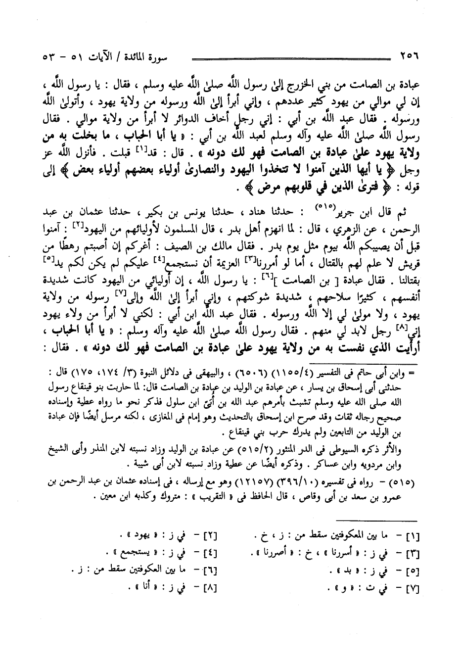 عُبَادَة بْن الصَّامِت مِنْ بَنِي الْحَارِث بْن الْخَزْرَج إِلَى رَسُول اللَّه - صَلَّى اللَّه عَلَيْهِ وَسَلَّمَ - فَقَالَ : يَا رَسُول اللَّه إِنَّ لِي مَوَالِي مِنْ يَهُود كَثِير عَدَدهمْ وَإِنِّي أَبْرَأ إِلَى اللَّه وَرَسُوله مِنْ وِلَايَة يَهُود وَأَتَوَلَّى اللَّه وَرَسُوله فَقَالَ عَبْد اللَّه بْن أُبَيّ : إِنِّي رَجُل أَخَاف الدَّوَائِر لَا أَبْرَأ مِنْ وِلَايَة مَوَالِيّ فَقَالَ رَسُول اللَّه - صَلَّى اللَّه عَلَيْهِ وَسَلَّمَ - لِعَبْدِ اللَّه اِبْن أُبَيّ يَا أَبَا الْحُبَاب مَا بَخِلْت بِهِ مِنْ وِلَايَة يَهُود عَلَى عُبَادَة بْن الصَّامِت فَهُوَ لَك دُونه قَالَ قَدْ قَبِلْت فَأَنْزَلَ اللَّه عَزَّ وَجَلَّ " يَا أَيّهَا الَّذِينَ آمَنُوا لَا تَتَّخِذُوا الْيَهُود وَالنَّصَارَى أَوْلِيَاء" الْآيَتَيْنِ ثُمَّ قَالَ اِبْن جَرِير : حَدَّثَنَا هَنَّاد حَدَّثَنَا يُونُس بْن بُكَيْر حَدَّثَنَا عُثْمَان بْن عَبْد الرَّحْمَن عَنْ الزُّهْرِيّ قَالَ لَمَّا اِنْهَزَمَ أَهْلُ بَدْر قَالَ الْمُسْلِمُونَ لِأَوْلِيَائِهِمْ مِنْ الْيَهُود أَسْلِمُوا قَبْل أَنْ يُصِيبكُمْ اللَّه بِيَوْمٍ مِثْل يَوْم بَدْر فَقَالَ مَالِك بْن الصَّيْف أَغَرَّكُمْ أَنْ أَصَبْتُمْ رَهْطًا مِنْ قُرَيْش لَا عِلْم لَهُمْ بِالْقِتَالِ أَمَا لَوْ أَسْرَرْنَا الْعَزِيمَة أَنْ نَسْتَجْمِع عَلَيْكُمْ لَمْ يَكُنْ لَكُمْ يَد أَنْ تُقَاتِلُونَا فَقَالَ عُبَادَة بْن الصَّامِت يَا رَسُول اللَّه إِنَّ أَوْلِيَائِي مِنْ الْيَهُود كَانَتْ شَدِيدَة أَنْفُسُهُمْ كَثِيرًا سِلَاحُهُمْ شَدِيدَةً شَوْكَتُهُمْ وَإِنِّي أَبْرَأُ إِلَى اللَّه وَرَسُوله مِنْ وِلَايَة يَهُود وَلَا مَوْلَى لِي إِلَّا اللَّه وَرَسُوله فَقَالَ عَبْد اللَّه بْن أُبَيّ لَكِنِّي لَا أَبْرَأ مِنْ وِلَايَة يَهُود إِنِّي رَجُل لَا بُدّ لِي مِنْهُمْ فَقَالَ : رَسُول اللَّه - صَلَّى اللَّه عَلَيْهِ وَآلِهِ وَسَلَّمَ - : " يَا أَبَا الْحُبَاب أَرَأَيْت الَّذِي نَفِسْت بِهِ مِنْ وِلَايَة يَهُود عَلَى عُبَادَة بْن الصَّامِت فَهُوَ لَك دُونه فَقَالَ :