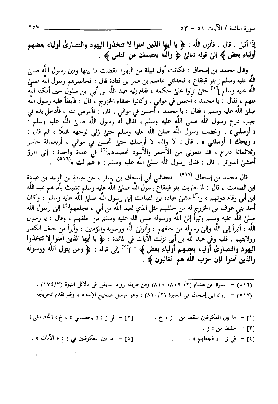 إِذًا أَقْبَلُ قَالَ فَأَنْزَلَ اللَّه " يَا أَيّهَا الَّذِينَ آمَنُوا لَا تَتَّخِذُوا الْيَهُود وَالنَّصَارَى أَوْلِيَاء " إِلَى قَوْله تَعَالَى " وَاَللَّه يَعْصِمك مِنْ النَّاس" وَقَالَ مُحَمَّد بْن إِسْحَاق فَكَانَتْ أَوَّل قَبِيلَة مِنْ الْيَهُود نَقَضَتْ مَا بَيْنهَا وَبَيْن رَسُول اللَّه - صَلَّى اللَّه عَلَيْهِ وَسَلَّمَ - بَنُو قَيْنُقَاع فَحَدَّثَنِي عَاصِم بْن عُمَر بْن قَتَادَة قَالَ فَحَاصَرَهُمْ رَسُول اللَّه - صَلَّى اللَّه عَلَيْهِ وَآلِهِ وَسَلَّمَ - حَتَّى نَزَلُوا عَلَى حُكْمه فَقَامَ