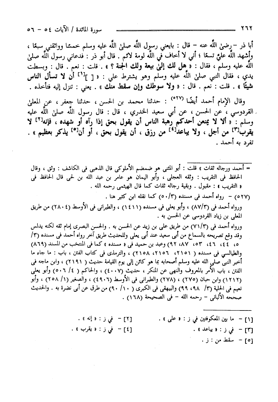 وَإِنْ سَقَطَ مِنْك يَعْنِي تَنْزِل إِلَيْهِ فَتَأْخُذهُ وَقَالَ الْإِمَام أَحْمَد أَيْضًا حَدَّثَنَا مُحَمَّد بْن الْحَسَن حَدَّثَنَا جَعْفَر عَنْ الْمُعَلَّى الْفِرْدَوْسِيّ عَنْ الْحَسَن عَنْ أَبِي سَعِيد الْخُدْرِيّ قَالَ : قَالَ رَسُول اللَّه صَلَّى اللَّه تَعَالَى عَلَيْهِ وَآلِهِ وَسَلَّمَ - أَلَا لَا يَمْنَعَنَّ أَحَدَكُمْ رَهْبَةُ النَّاسِ أَنْ يَقُول بِحَقٍّ إِذَا رَآهُ أَوْ شَهِدَهُ فَإِنَّهُ لَا يُقَرِّب مِنْ أَجَلٍ وَلَا يُبَاعِد مِنْ رِزْق أَنْ يَقُول بِحَقٍّ أَوْ أَنْ يُذَكِّر بِعَظِيمٍ " تَفَرَّدَ بِهِ" أَحْمَد