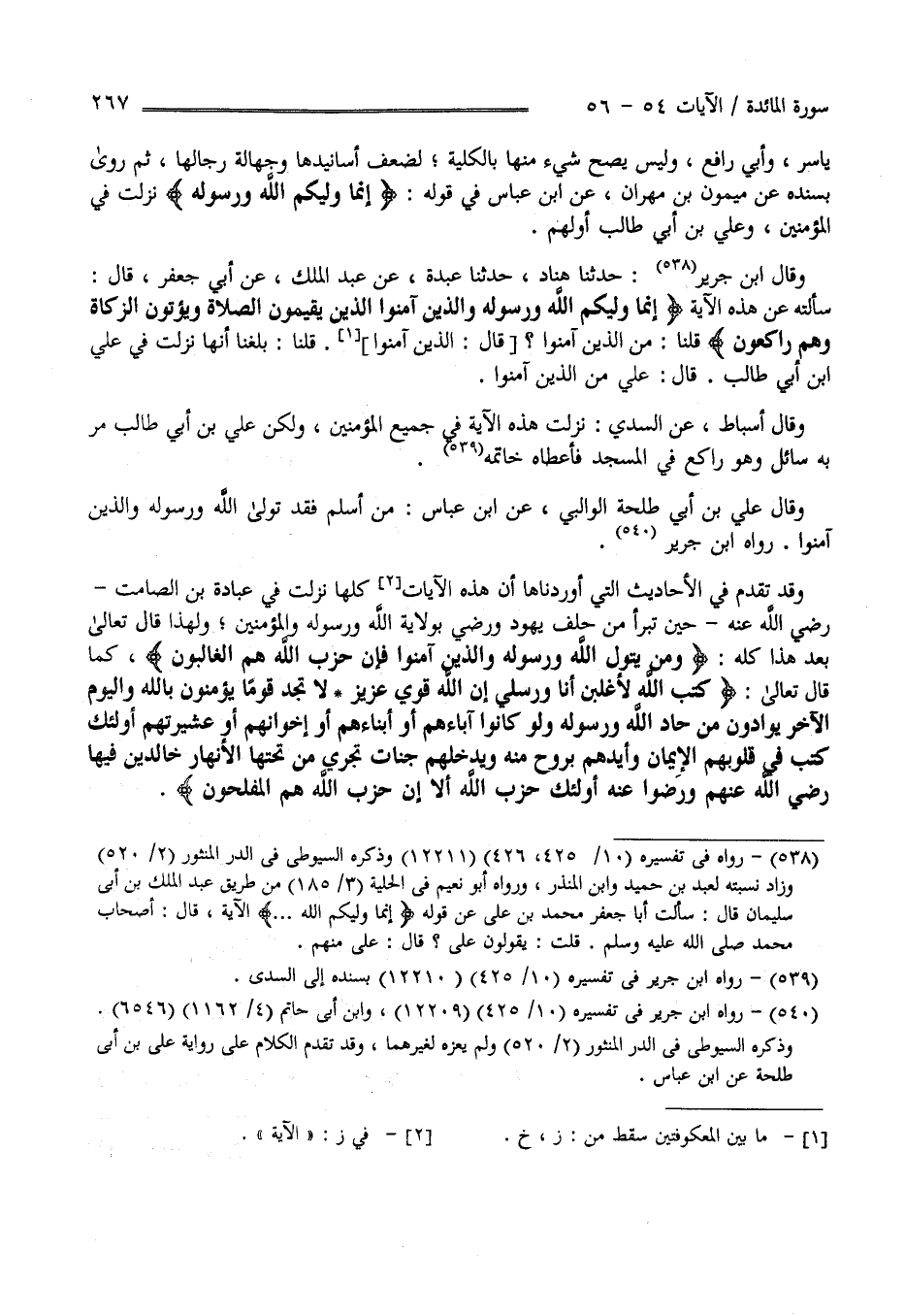 يَاسِر وَأَبِي رَافِع وَلَيْسَ يَصِحّ شَيْء مِنْهَا بِالْكُلِّيَّةِ لِضَعْفِ أَسَانِيدهَا وَجَهَالَة رِجَالهَا ثُمَّ رَوَى بِإِسْنَادِهِ عَنْ مَيْمُون بْن مِهْرَان عَنْ اِبْن عَبَّاس فِي قَوْله " إِنَّمَا وَلِيّكُمْ اللَّه وَرَسُوله " نَزَلَتْ فِي الْمُؤْمِنِينَ وَعَلِيّ بْن أَبِي طَالِب أَوَّلهمْ وَقَالَ اِبْن جَرِير حَدَّثَنَا هَنَّاد حَدَّثَنَا عَبْدَة عَنْ عَبْد الْمَلِك عَنْ أَبِي جَعْفَر قَالَ سَأَلْته عَنْ هَذِهِ الْآيَة " إِنَّمَا وَلِيّكُمْ اللَّه وَرَسُوله وَاَلَّذِينَ آمَنُوا الَّذِينَ يُقِيمُونَ الصَّلَاة وَيُؤْتُونَ الزَّكَاة وَهُمْ رَاكِعُونَ" قُلْنَا مَنْ الَّذِينَ آمَنُوا ؟ قَالَ الَّذِينَ آمَنُوا قُلْنَا بَلَغَنَا أَنَّهَا نَزَلَتْ فِي عَلِيّ بْن أَبِي طَالِب قَالَ عَلِيّ مِنْ الَّذِينَ آمَنُوا وَقَالَ أَسْبَاط عَنْ السُّدِّيّ نَزَلَتْ هَذِهِ الْآيَة فِي جَمِيع الْمُؤْمِنِينَ وَلَكِنَّ عَلِيّ بْن أَبِي طَالِب مَرَّ بِهِ سَائِل وَهُوَ رَاكِع فِي الْمَسْجِد فَأَعْطَاهُ خَاتَمه وَقَالَ عَلِيّ بْن أَبِي طَلْحَة الْوَالِبِيّ عَنْ اِبْن عَبَّاس عَنْ أَسْلَمَ فَقَدْ تَوَلَّى اللَّه وَرَسُوله وَاَلَّذِينَ آمَنُوا رَوَاهُ اِبْن جَرِير وَقَدْ تَقَدَّمَ فِي الْأَحَادِيث الَّتِي أَوْرَدْنَاهَا أَنَّ هَذِهِ الْآيَات كُلّهَا نَزَلَتْ فِي عُبَادَة بْن الصَّامِت - رَضِيَ اللَّه عَنْهُ - حِين تَبَرَّأَ مِنْ حِلْف الْيَهُود وَرَضِيَ بِوِلَايَةِ اللَّه وَرَسُوله وَالْمُؤْمِنِينَ وَلِهَذَا قَالَ تَعَالَى بَعْد هَذَا كُلّه " وَمَنْ يَتَوَلَّ اللَّه وَرَسُوله وَاَلَّذِينَ آمَنُوا فَإِنَّ حِزْب اللَّه هُمْ الْغَالِبُونَ " كَمَا قَالَ تَعَالَى" كَتَبَ اللَّه لَأَغْلِبَنَّ أَنَا وَرُسُلِي إِنَّ اللَّه قَوِيّ عَزِيز لَا تَجِد قَوْمًا يُؤْمِنُونَ بِاَللَّهِ وَالْيَوْم الْآخِر يُوَادُّونَ مَنْ حَادَّ اللَّه وَرَسُوله وَلَوْ كَانُوا آبَاءَهُمْ أَوْ أَبْنَاءَهُمْ أَوْ إِخْوَانهمْ أَوْ عَشِيرَتهمْ أُولَئِكَ كَتَبَ فِي قُلُوبهمْ الْإِيمَان وَأَيَّدَهُمْ بِرُوحٍ مِنْهُ وَيُدْخِلهُمْ جَنَّات تَجْرِي مِنْ تَحْتهَا الْأَنْهَار خَالِدِينَ فِيهَا رَضِيَ اللَّه عَنْهُمْ وَرَضُوا عَنْهُ أُولَئِكَ حِزْب اللَّه أَلَا إِنَّ حِزْب اللَّه هُمْ الْمُفْلِحُونَ " .