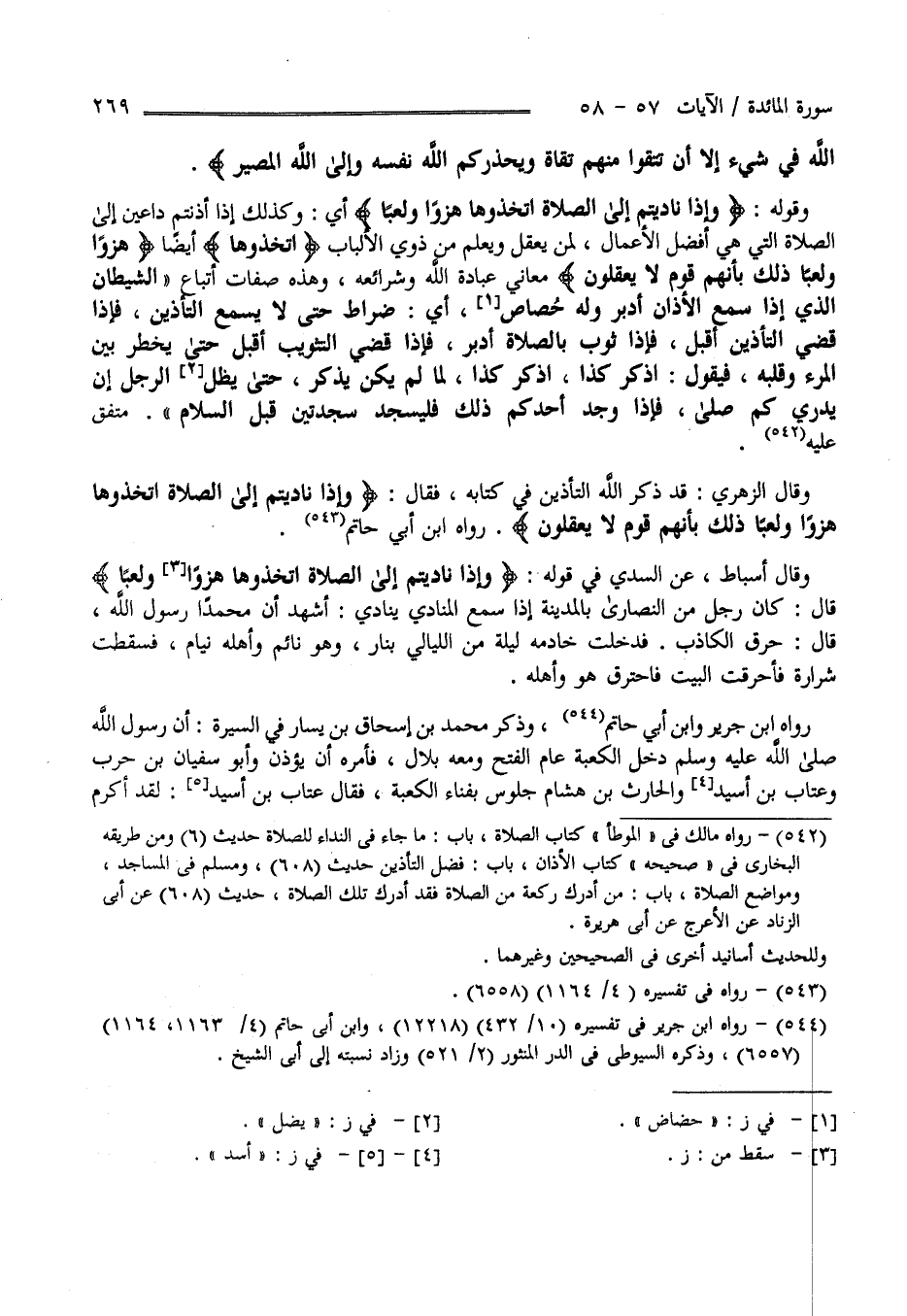 وَقَوْله " وَإِذَا نَادَيْتُمْ إِلَى الصَّلَاة اِتَّخَذُوهَا هُزُوًا وَلَعِبًا " أَيْ وَكَذَلِكَ إِذَا أَذَّنْتُمْ دَاعِينَ إِلَى الصَّلَاة الَّتِي هِيَ أَفْضَل الْأَعْمَال لِمَنْ يَعْقِل وَيَعْلَم مِنْ ذَوِي الْأَلْبَاب اِتَّخَذُوهَا أَيْضًا" هُزُوًا وَلَعِبًا ذَلِكَ بِأَنَّهُمْ قَوْم لَا يَعْقِلُونَ " مَعَانِي عِبَادَة اللَّه وَشَرَائِعه وَهَذِهِ صِفَات أَتْبَاع الشَّيْطَان " الَّذِي إِذَا سَمِعَ الْمُنَادِي أَدْبَرَ وَلَهُ حُصَاص أَيْ ضُرَاط حَتَّى لَا يَسْمَع التَّأْذِين فَإِذَا قُضِيَ التَّأْذِين أَقْبَلَ فَإِذَا ثُوِّبَ لِلصَّلَاةِ أَدْبَرَ فَإِذَا قُضِيَ التَّثْوِيب أَقْبَلَ حَتَّى يَخْطُر بَيْن الْمَرْء وَقَلْبه فَيَقُول اُذْكُرْ كَذَا اُذْكُرْ كَذَا لَمَّا لَمْ يَكُنْ يَذْكُر حَتَّى يَظَلّ الرَّجُل لَا يَدْرِي كَمْ صَلَّى فَإِذَا وَجَدَ أَحَدكُمْ ذَلِكَ فَلْيَسْجُدْ سَجْدَتَيْنِ قَبْل السَّلَام " مُتَّفَق عَلَيْهِ .