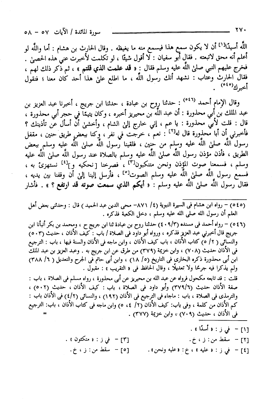 اللَّه أَسِيدًا أَنْ لَا يَكُون سَمِعَ هَذَا فَيَسْمَع مِنْهُ مَا يَغِيظهُ وَقَالَ الْحَارِث بْن هِشَام أَمَا وَاَللَّه لَوْ أَعْلَم أَنَّهُ مُحِقّ لَاتَّبَعْته فَقَالَ أَبُو سُفْيَان لَا أَقُول شَيْئًا لَوْ تَكَلَّمْت لَأَخْبَرَتْ عَنِّي هَذِهِ الْحَصَى فَخَرَجَ عَلَيْهِمْ النَّبِيّ - صَلَّى اللَّه عَلَيْهِ وَسَلَّمَ - فَقَالَ " قَدْ عَلِمْت الَّذِي قُلْتُمْ " ثُمَّ ذَكَرَ ذَلِكَ لَهُمْ فَقَالَ الْحَارِث وَعَتَّاب : نَشْهَد أَنَّك رَسُول اللَّه مَا اِطَّلَعَ عَلَى هَذَا أَحَد كَانَ مَعَنَا فَنَقُول أَخْبَرَك وَقَالَ الْإِمَام أَحْمَد حَدَّثَنَا رَوْح بْن عُبَادَة حَدَّثَنَا اِبْن جُرَيْج أَخْبَرَنَا عَبْد الْعُزَيْر بْن عَبْد الْمَلِك بْن أَبِي مَحْذُورَة أَنَّ عَبْد اللَّه بْن مُحَيْرِيز أَخْبَرَهُ وَكَانَ يَتِيمًا فِي حِجْر أَبِي مَحْذُورَة قَالَ : قُلْت لِأَبِي مَحْذُورَة يَا عَمّ إِنِّي خَارِج إِلَى الشَّام وَأَخْشَى أَنْ أُسْأَل عَنْ تَأْذِينك فَأَخْبَرَنِي أَنَّ أَبَا مَحْذُورَة قَالَ لَهُ نَعَمْ خَرَجْت فِي نَفَر وَكُنَّا فِي بَعْض طَرِيق حُنَيْن مَقْفَل رَسُول اللَّه - صَلَّى اللَّه عَلَيْهِ وَسَلَّمَ - مِنْ حُنَيْن فَلَقِينَا رَسُولَ اللَّه - صَلَّى اللَّه عَلَيْهِ وَسَلَّمَ - بِبَعْضِ الطَّرِيق فَأَذَّنَ مُؤَذِّن رَسُول اللَّه - صَلَّى اللَّه عَلَيْهِ وَسَلَّمَ - بِالصَّلَاةِ عِنْد رَسُول اللَّه - صَلَّى اللَّه عَلَيْهِ وَسَلَّمَ - فَسَمِعْت صَوْت الْمُؤَذِّن وَنَحْنُ مُتَنَكِّبُونَ فَصَرَخْنَا نَحْكِيه وَنَسْتَهْزِئ بِهِ فَسَمِعَ رَسُول اللَّه فَأَرْسَلَ إِلَيْنَا إِلَى أَنْ وَقَفْنَا بَيْن يَدَيْهِ فَقَالَ رَسُول اللَّه - صَلَّى اللَّه عَلَيْهِ وَسَلَّمَ - أَيُّكُمْ الَّذِي سَمِعْت صَوْته قَدْ اِرْتَفَعَ ؟ فَأَشَارَ
