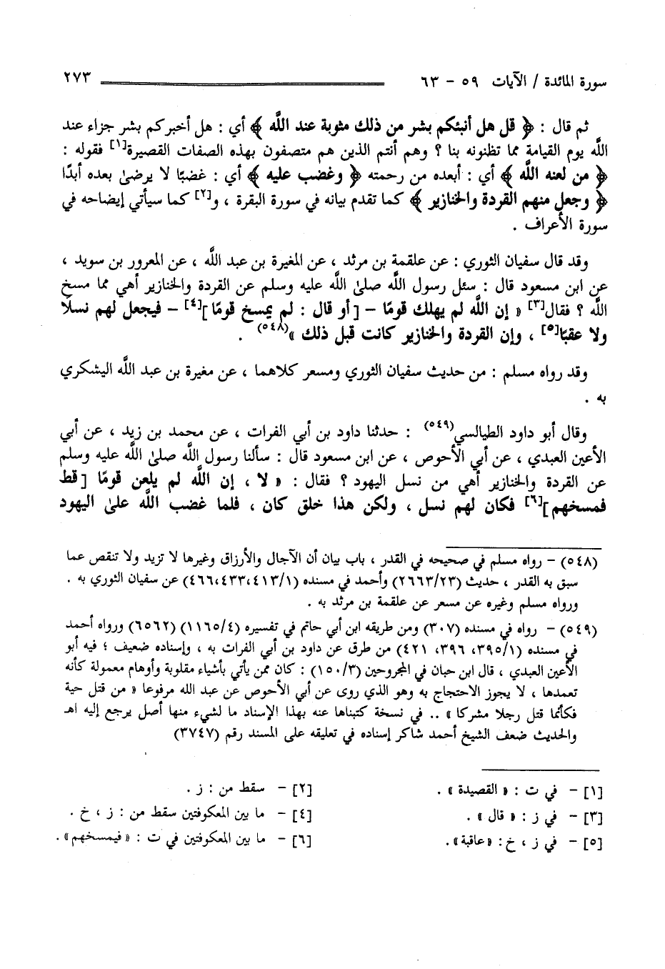 قَالَ " قُلْ هَلْ أُنَبِّئكُمْ بِشَرٍّ مِنْ ذَلِكَ مَثُوبَة عِنْد اللَّه " أَيْ هَلْ أُخْبِركُمْ بِشَرِّ جَزَاء عِنْد اللَّه يَوْم الْقِيَامَة مِمَّا تَظُنُّونَهُ بِنَا ؟ وَهُمْ أَنْتُمْ الَّذِينَ هُمْ مُتَّصِفُونَ بِهَذِهِ الصِّفَات الْمُفَسَّرَة بِقَوْلِهِ " مَنْ لَعَنَهُ اللَّه " أَيْ أَبْعَدَهُ مِنْ رَحْمَته" وَغَضِبَ عَلَيْهِ " أَيْ غَضَبًا لَا يَرْضَى بَعْده أَبَدًا " وَجَعَلَ مِنْهُمْ الْقِرَدَة وَالْخَنَازِير " كَمَا تَقَدَّمَ بَيَانه فِي سُوَره الْبَقَرَة وَكَمَا سَيَأْتِي إِيضَاحه فِي سُورَة الْأَعْرَاف وَقَدْ قَالَ سُفْيَان الثَّوْرِيّ عَنْ عَلْقَمَة بْن يَزِيد عَنْ الْمُغِيرَة بْن عَبْد اللَّه عَنْ الْمَعْرُور بْن سُوَيْد عَنْ اِبْن مَسْعُود قَالَ : سُئِلَ رَسُول اللَّه - صَلَّى اللَّه عَلَيْهِ وَسَلَّمَ - عَنْ الْقِرَدَة وَالْخَنَازِير أَهِيَ مِمَّا مَسَخَ اللَّهُ فَقَالَ إِنَّ اللَّه لَمْ يُهْلِك قَوْمًا أَوْ قَالَ لَمْ يَمْسَخ قَوْمًا فَيَجْعَل لَهُمْ نَسْلًا وَلَا عَقِبًا وَإِنَّ الْقِرَدَة وَالْخَنَازِير كَانَتْ قَبْل ذَلِكَ وَقَدْ رَوَاهُ مُسْلِم مِنْ حَدِيث سُفْيَان الثَّوْرِيّ وَمِسْعَر كِلَاهُمَا عَنْ مُغِيرَة بْن عَبْد اللَّه الْيَشْكُرِيّ بِهِ وَقَالَ أَبُو دَاوُدَ الطَّيَالِسِيّ حَدَّثَنَا دَاوُد بْن أَبِي الْفُرَات عَنْ مُحَمَّد بْن زَيْد عَنْ أَبِي الْأَعْيَن الْعَبْدِيّ عَنْ أَبِي الْأَحْوَص عَنْ اِبْن مَسْعُود قَالَ سَأَلْنَا رَسُول اللَّه - صَلَّى اللَّه عَلَيْهِ وَسَلَّمَ - عَنْ الْقِرَدَة وَالْخَنَازِير أَهِيَ مِنْ نَسْل الْيَهُود فَقَالَ : " لَا إِنَّ اللَّه لَمْ يَلْعَن قَوْمًا قَطُّ فَيَمْسَخهُمْ فَكَانَ لَهُمْ نَسْل وَلَكِنْ هَذَا خَلْق كَانَ فَلَمَّا غَضِبَ اللَّه عَلَى الْيَهُود